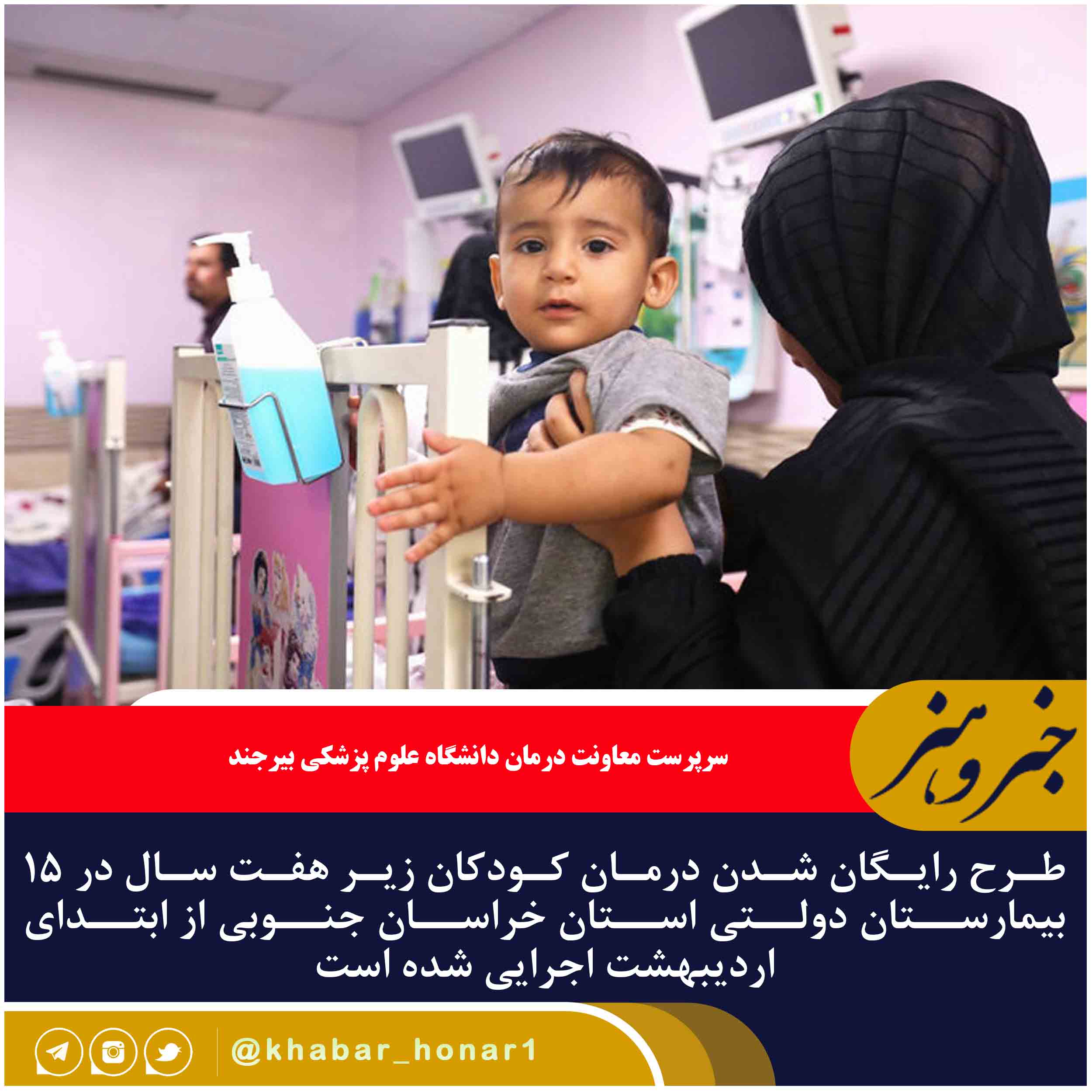 سرپرست معاونت درمان دانشگاه علوم پزشکی بیرجند گفت: طرح رایگان شدن درمان کودکان زیر هفت سال در ۱۵ بیمارستان دولتی استان خراسان جنوبی از ابتدای اردیبهشت ماه امسال اجرایی شده است.