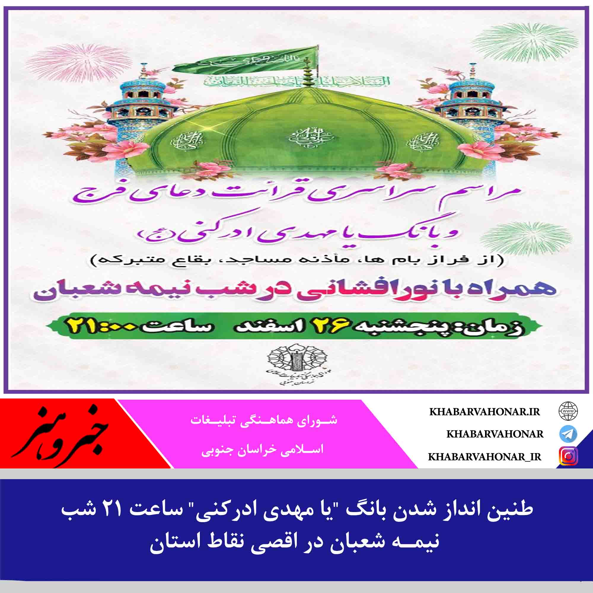 در آستانۀ میلاد مسعود و فرخنده حضرت حجت ابن حسن العسکری(عج)، شـورای هماهـنگی تبلیـغات اسـلامی خراسان جنوبی با صدور اطلاعیه ای عنوان کرد: بانگ “یا مهدی ادرکنی” ساعت ۲۱ شب نیمـه شعبان در تمام نقاط استان همزمان باسراسر کشور طنین انداز خواهد شد.