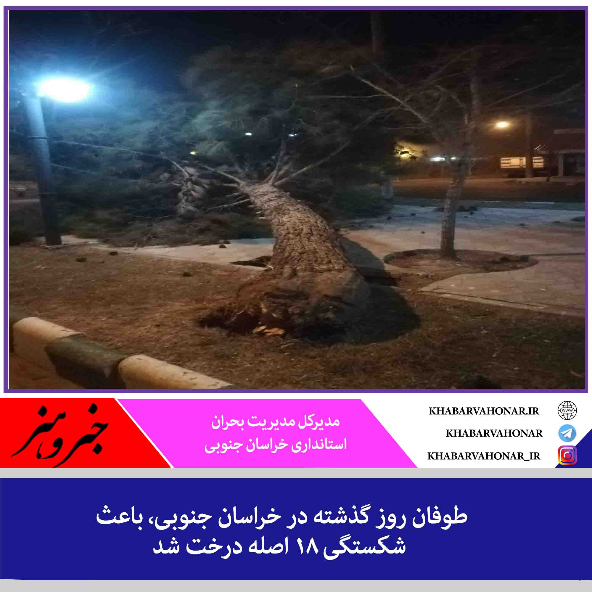 مدیرکل مدیریت بحران استانداری خراسان جنوبی گفت: طوفان روز گذشته در خراسان جنوبی، باعث شکستگی ۱۸ اصله درخت شد.