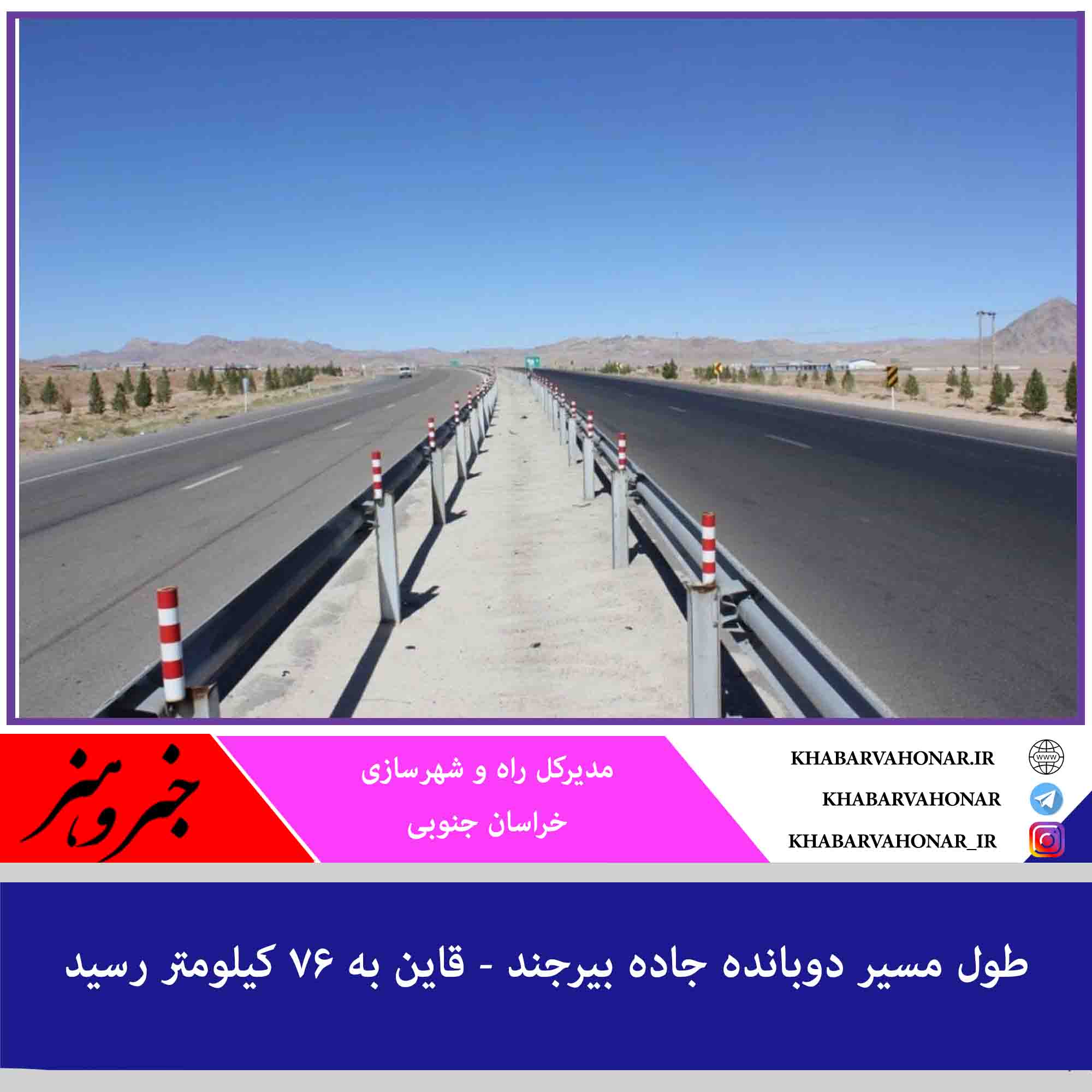مدیرکل راه و شهرسازی خراسان جنوبی گفت: طول جاده بیرجند – قاین ۱۰۰ کیلومتر است که تاکنون مسیر دوبانده این جاده به ۷۶ کیلومتر رسیده و تلاش برای تکمیل دوباندهسازی آن ادامه دارد.