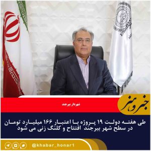 شهردار بیرجند گفت: طی هفته دولت ۱۹ پروژه با اعتبار ۱۶۶ میلیارد تومان در سطح شهر افتتاح و کلنگ زنی می شود.