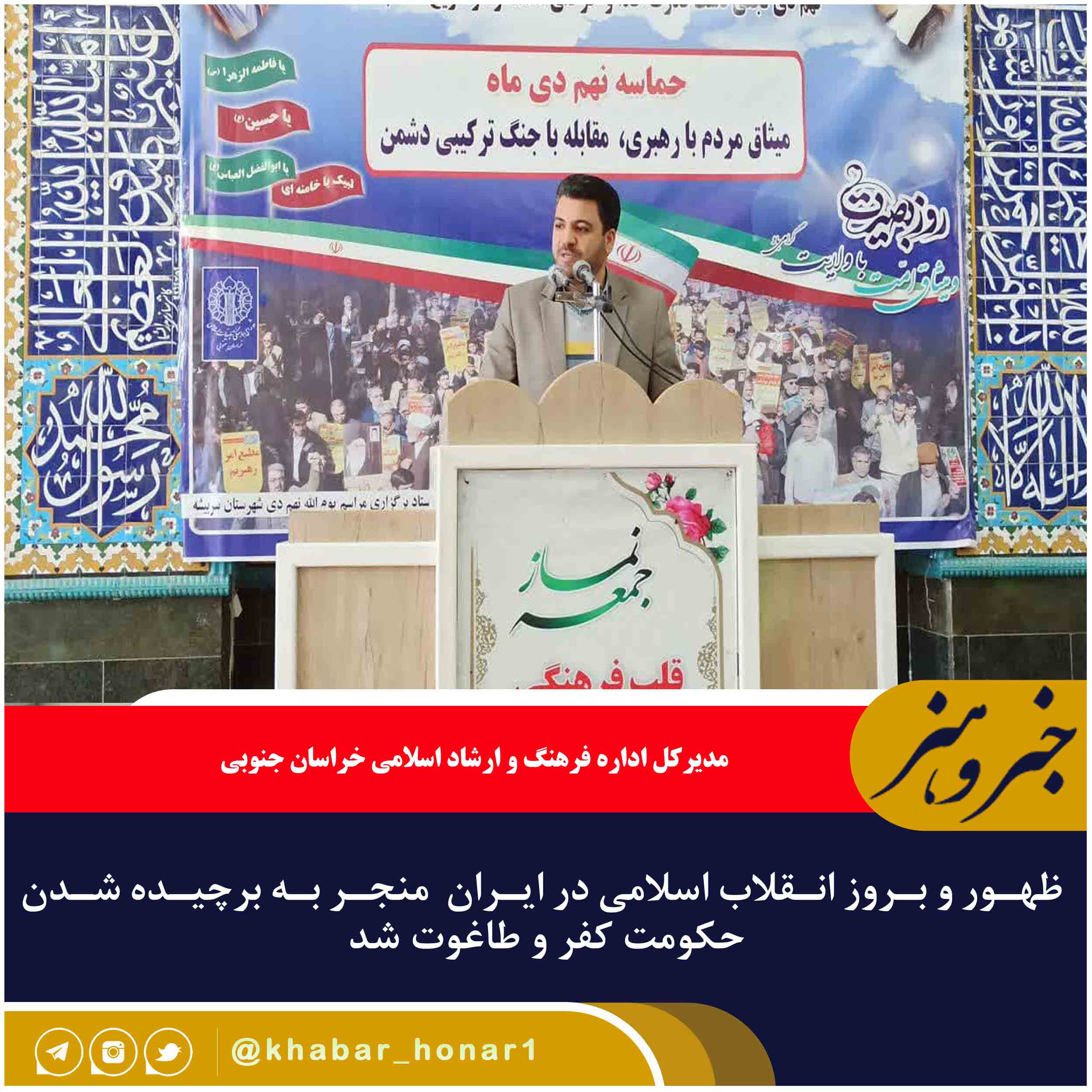 مدیرکل اداره فرهنگ و ارشاد اسلامی خراسان جنوبی پیش از خطبه های نماز جمعه شهر سربیشه گفت: تداوم انقلاب اسلامی نیازمند برنامه ریزی ،همراهی مردم و جهان. بینی توحیدی است.علی فرخنده در این مراسم ضمن گرامیداشت یاد و خاطره شهدا به خصوص شهدای عزیز مدافع امنیت و تسلیت ایام فاطمیه(س) با اشاره به چند اتفاق تاریخی که در زندگی بشر تاثیرگذار بوده اند گفت: بعثت نبی اکرم اولین حادثه مبارک و خجسته است که منجر به تغییر راه بشر و نقطه جدای کفر از نور الهی است، مسئله بعدی غدیر است، مسئله سوم عاشوراست که منجر به احیای مجدد بعثت شد، چهارمین حادثه مهم در اسلام ظهور و بروز انقلاب اسلامی در ایران بود که منجر به برچیده شدن حکومت کفر و طاغوت شد؛ نهایتاً مسئلهای که تحقق آن نیازمند مقدمات و تغییراتی در ابعاد فردی و چه اجتماعی می باشد مسئله ظهور ولی عصر، امام زمان (عج) و تشکیل حکومت واحد اسلامی می باشد.