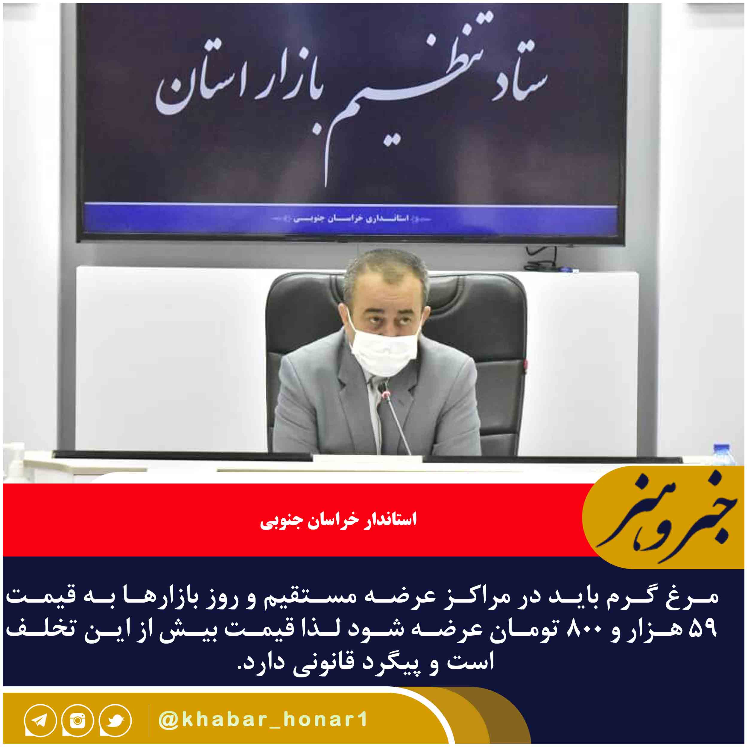 استاندار خراسان جنوبی گفت: : بنا به دستورالعمل کشوری، مرغ گرم باید در مراکز عرضه مستقیم و روز بازارها به قیمت ۵۹ هزار و ۸۰۰ تومان عرضه شود لذا قیمت بیش از این تخلف است و پیگرد قانونی دارد.
