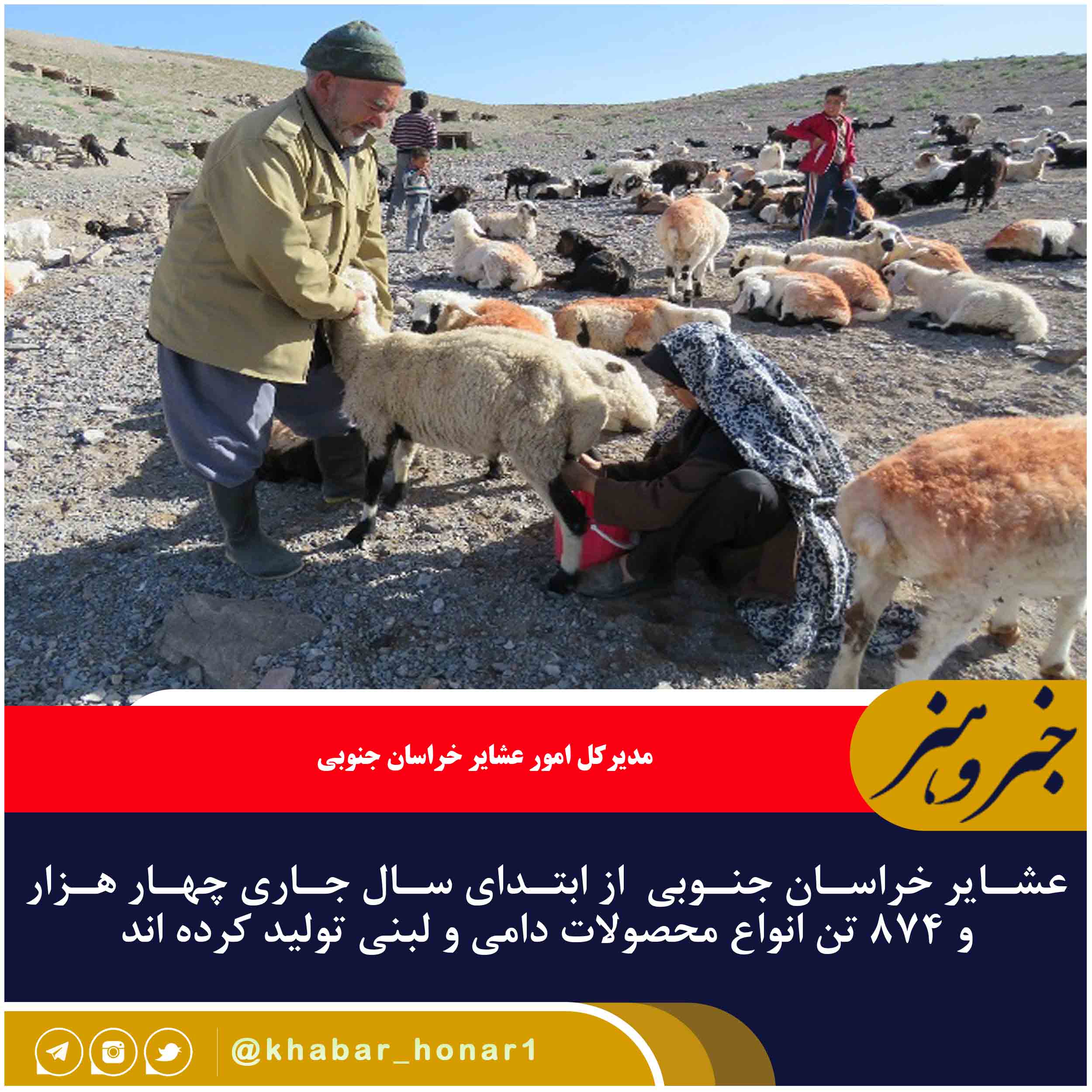 مدیرکل امور عشایر خراسان جنوبی گفت: عشایر استان از ابتدای سال جاری تاکنون چهار هزار و ۸۷۴ تن انواع محصولات دامی و لبنی تولید کردند که از این مقدار ۲ هزار و ۲۲۱ تن شیر گوسفند بوده است.