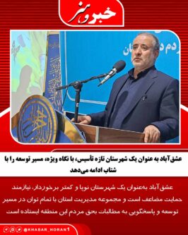 به گفته وی؛ شهرستان عشقآباد مانند فرزندی است که تازه در مسیر توسعه قرار گرفته و باید دست او را گرفت تا مسیر پیشرفت را با ثبات ادامه دهد.