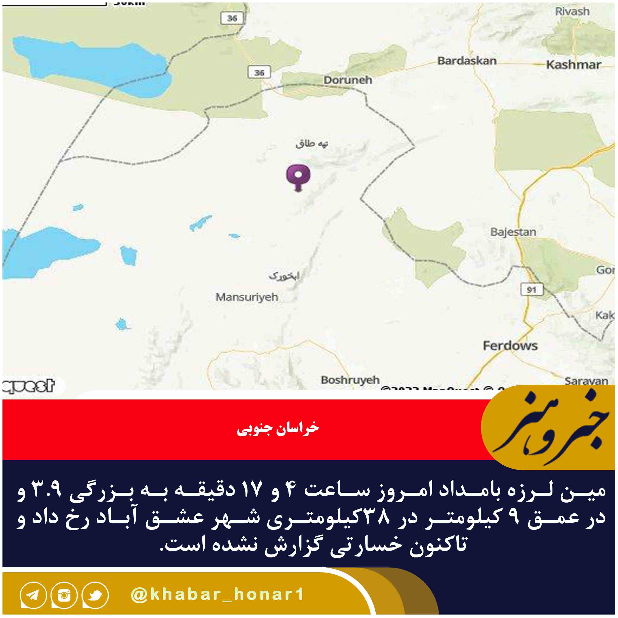 این زمین لرزه بامداد امروز ساعت ۴ و ۱۷ دقیقه به بزرگی ۳.۹ و در عمق ۹ کیلومتر در ۳۸کیلومتری شهر عشق آباد رخ داد و تاکنون خسارتی گزارش نشده است.