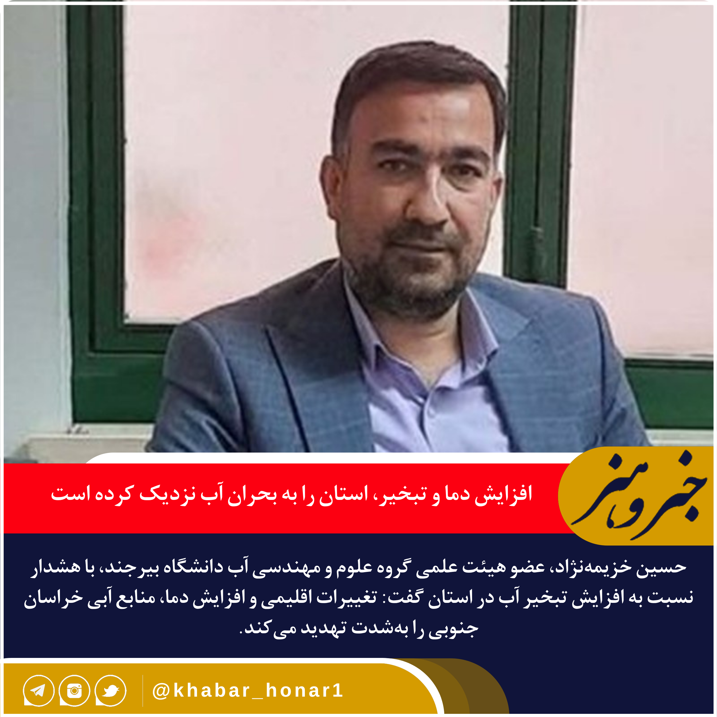 خزیمهنژاد در نشست کارگروه سازگاری با کمآبی استان، وضعیت بحرانی منابع آبی خراسان جنوبی را تشریح کرد و افزود: افزایش دما، حتی به میزان یک درجه، میتواند موجب افزایش شش درصدی تبخیر آب شود و با نرخ تبخیر بیش از ۹۳ درصد در استان، منابع آبی بهشدت تحت فشار هستند.