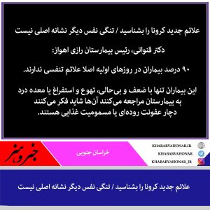 علائم جدید کرونا را بشناسید / تنگی نفس دیگر نشانه اصلی نیست دکتر قنواتی، رئیس بیمارستان رازی اهواز: ۹۰ درصد بیماران در روزهای اولیه اصلا علائم تنفسی ندارند. این بیماران تنها با ضعف و بیحالی، تهوع و استفراغ یا معده درد به بیمارستان مراجعه میکنند آنها شاید فکر میکنند دچار عفونت رودهای یا مسمومیت غذایی هستند.