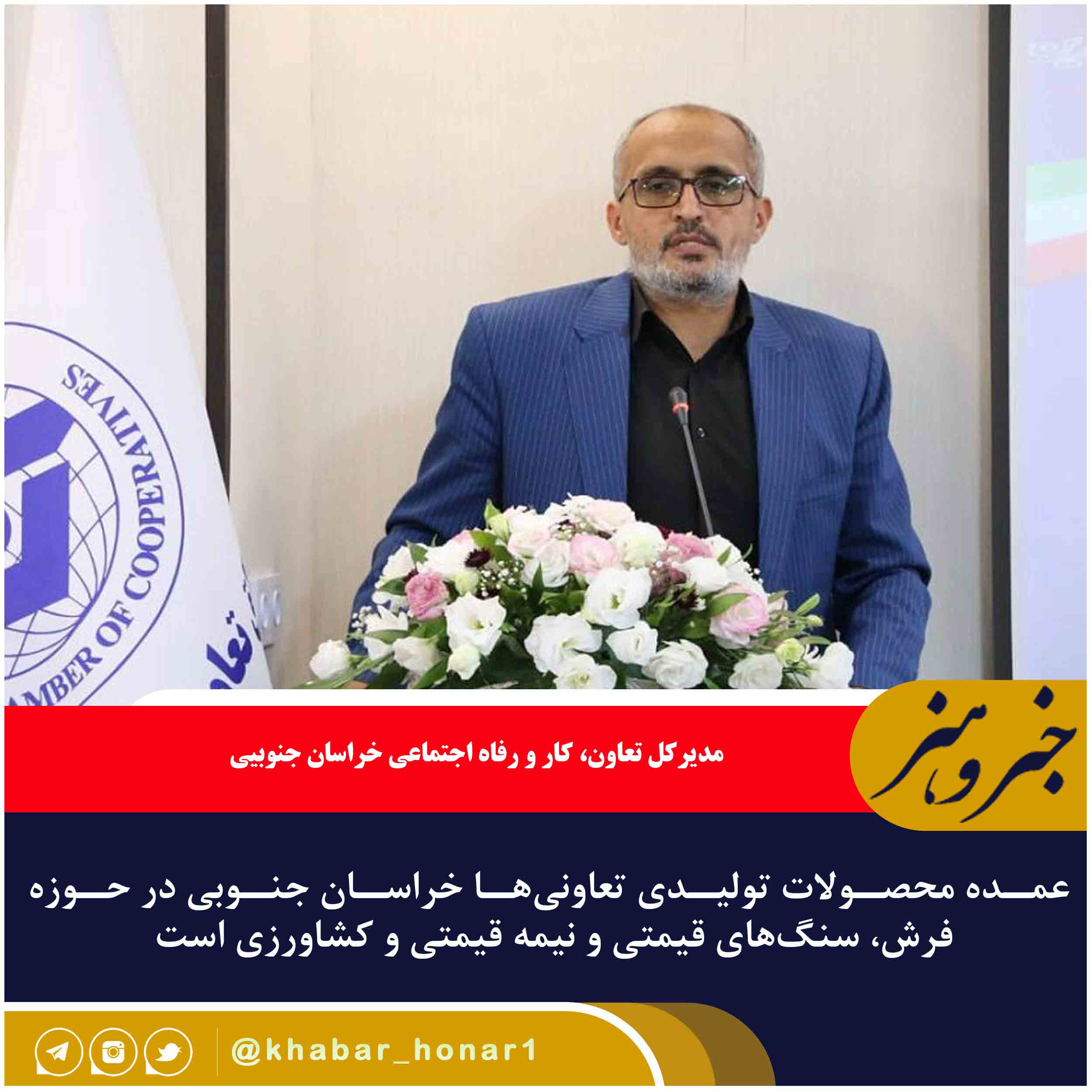 غلامرضا اشرفی روز چهارشنبه در هفدهمین آیین تجلیل از تعاونی های برتر خراسان جنوبی افزود: عمده محصولات تولیدی تعاونیها در حوزه فرش، سنگهای قیمتی و نیمه قیمتی و کشاورزی بوده است.