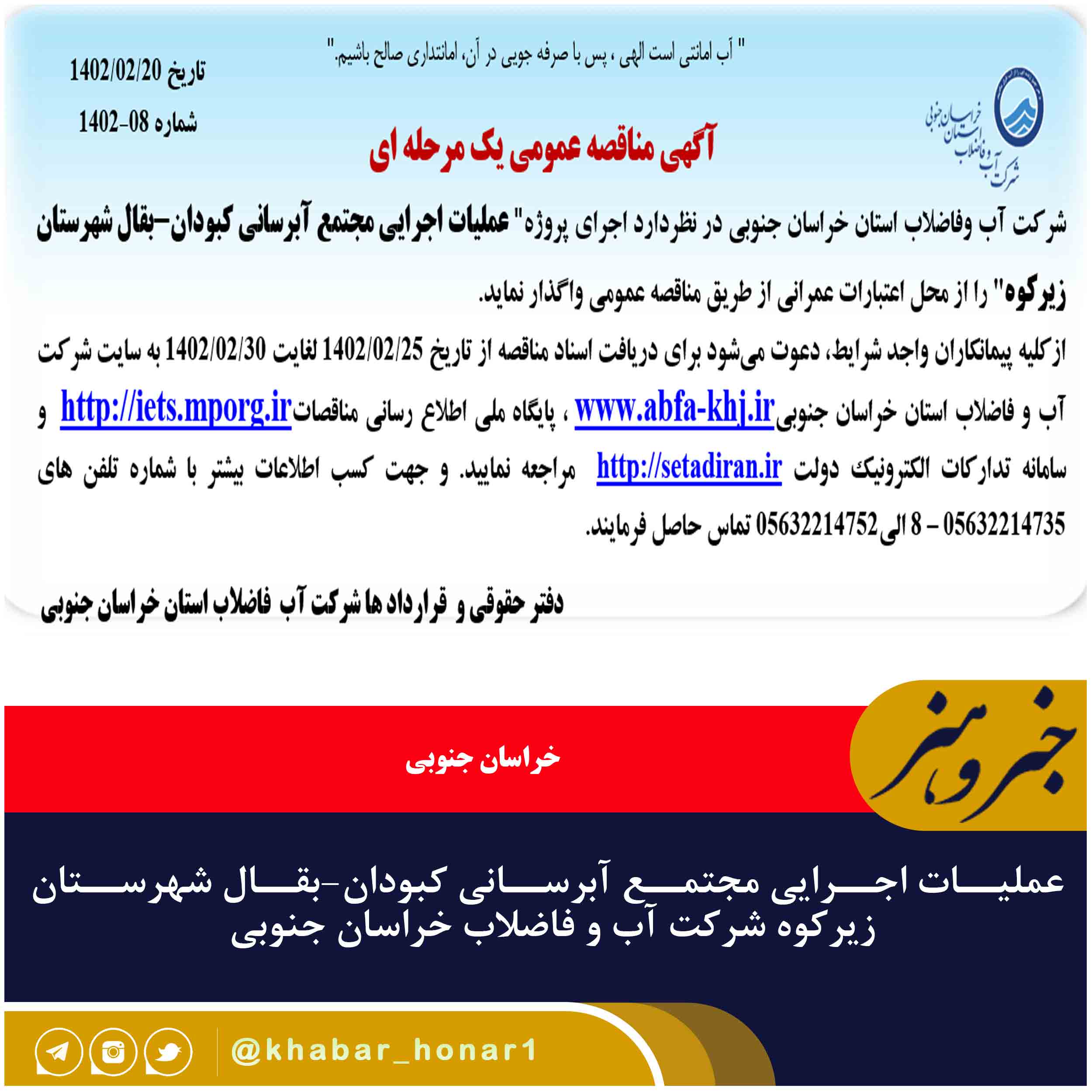 ازکلیه پیمانکاران واجد شرایط، دعوت میشود برای دریافت اسناد مناقصه از تاریخ ۲۵/۰۲/۱۴۰۲ لغایت ۳۰/۰۲/۱۴۰۲ به سایت شرکت آب و فاضلاب استان خراسان جنوبیwww.abfa-khj.ir ، پایگاه ملی اطلاع رسانی مناقصاتhttp://iets.mporg.ir و سامانه تدارکات الکترونیک دولت http://setadiran.ir مراجعه نمایید. و جهت کسب اطلاعات بیشتر با شماره تلفن های ۳۲۲۱۴۷۳۵۰۵۶ – 8 الی۰۵۶۳۲۲۱۴۷۵۲ تماس حاصل فرمایند.