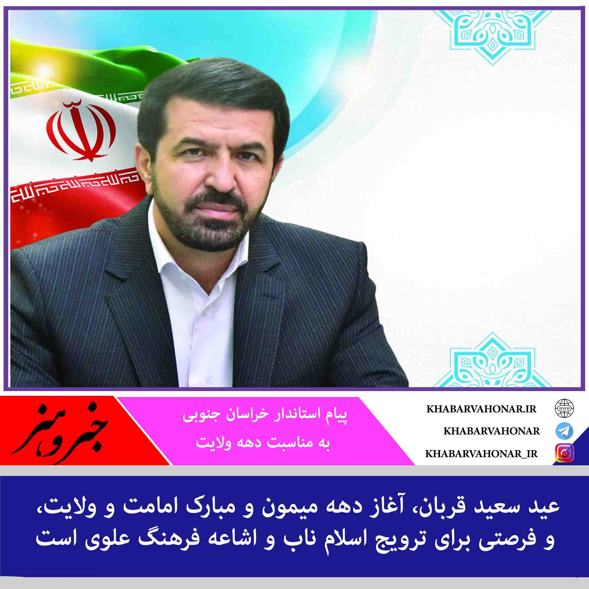 ?اینجانب ضمن تبریک این اعیاد خجسته به همه مسلمانان جهان، ملت ولایتمدار ایران اسلامی و مردمان متدین و متعهد خراسان جنوبی، امیدوارم همه ما بتوانیم به لطف عنایات حضرت پروردگار، در ظل توجهات حضرت بقیه الله الاعظم-آخرین ستاره کاروان امامت شیعه – منویات ولی امر مسلمین جهان، حضرت آیت الله خامنه ای(حفظه الله) را چراغ راه خود قرار دهیم تا مسیر مانده تا ظهور حضرت منجی را به سلامت و بدون هیچ لغزشی طی نماییم. ان شاء الله