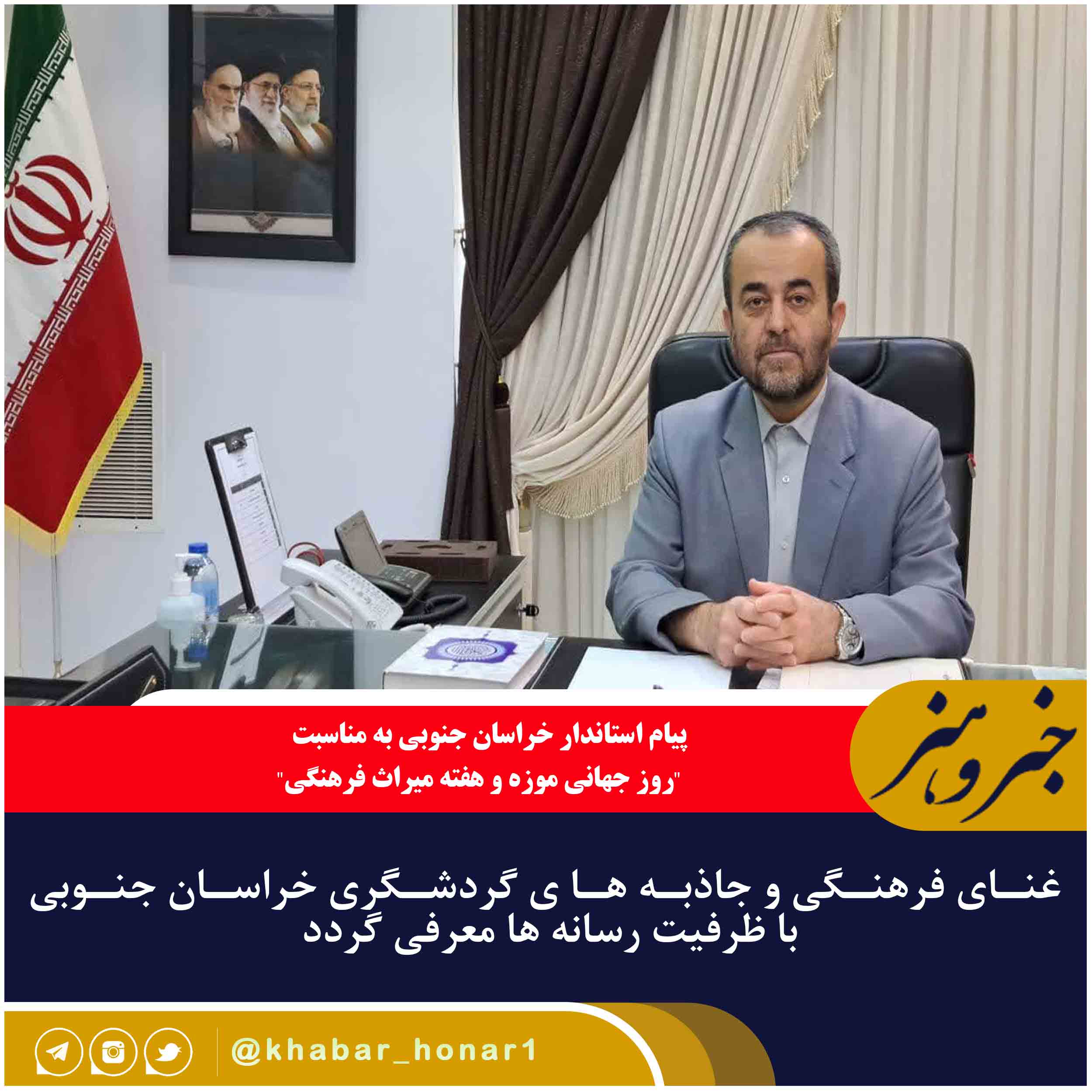 ?اینجانب ضمن گرامیداشت روز جهانی موزه و میراث فرهنگی، آغاز هفته میراث فرهنگی را به تمامی فعالان این عرصه در استان خراسان جنوبی که در معرفی و البته حفظ و احیای میراث گرانقدر این دیار، همت می ورزند، تبریک عرض می نمایم.