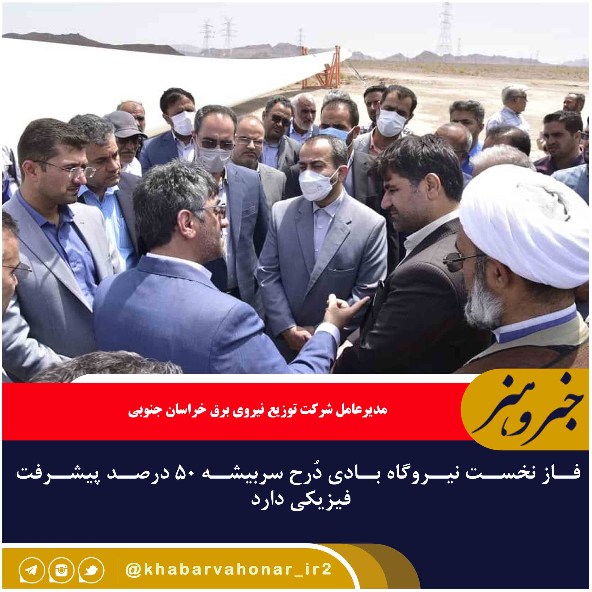 مدیرعامل شرکت توزیع نیروی برق خراسان جنوبی گفت: فاز نخست احداث نیروگاه بادی دُرح شهرستان سربیشه ۵۰ درصد پیشرفت فیزیکی دارد.