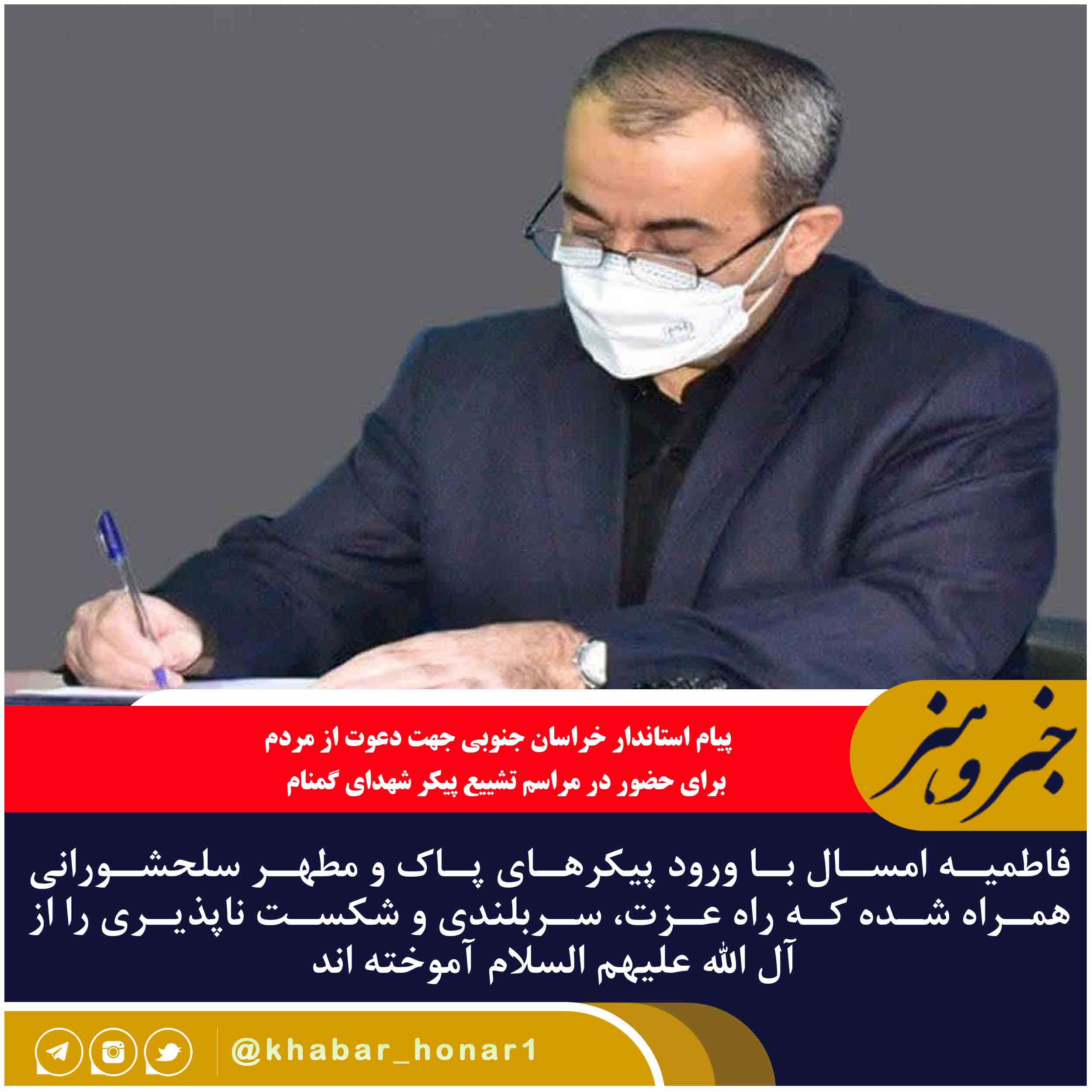 ?اینک که در ایام شهادت حضرت فاطمه زهرا(سلام الله علیها)، خراسان جنوبی میزبان ۶ شهید گرانقدر از شهدای گمنام دفاع مقدس است، بدینوسیله از آحاد مردم شریف، بصیر، انقلابی و همیشه در صحنه استان به ویژه جوانان، خانواده های معظم شهدا، ایثارگران، آزادگان و جانبازان دعوت می شود با حضور پرشور و حماسی در مراسم تشییع و تدفین پیکر آسمانی و سراسر نور شهدای گمنام تازه تفحص شده، ضمن ادای احترام به مقام شامخ این عزیزان، یک بار دیگر اتحاد و همبستگی خود را به رخ دشمنان قسم خورده این آب و خاک بکشند، امید که یاد و خاطر شهدای عزیز همواره زینت بخش قلب های همه مان باشد.