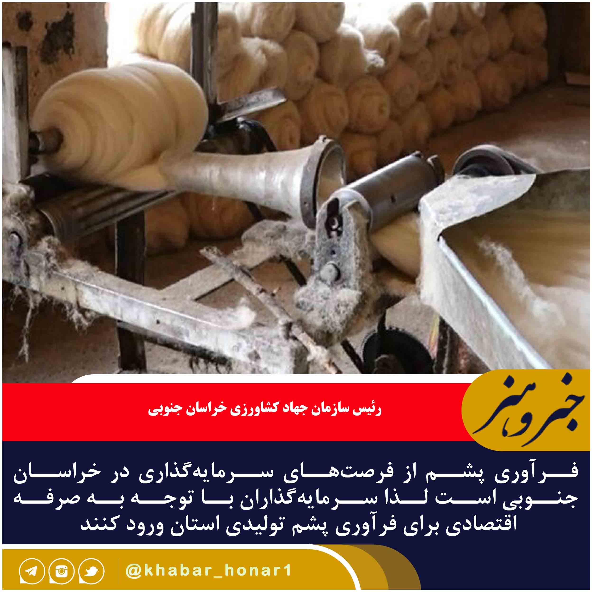 رئیس سازمان جهاد کشاورزی خراسان جنوبی گفت: فرآوری پشم از فرصتهای سرمایهگذاری در خراسان جنوبی است لذا سرمایهگذاران با توجه به صرفه اقتصادی برای فرآوری پشم تولیدی استان ورود کنند.