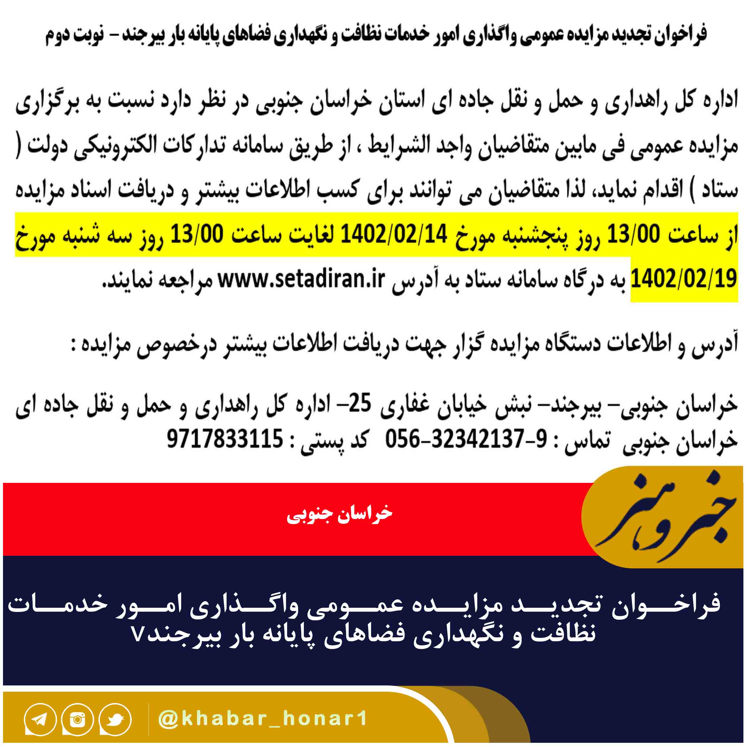 اداره کل راهداری و حمل و نقل جاده ای استان خراسان جنوبی در نظر دارد نسبت به برگزاری مزایده عمومی فی مابین متقاضیان واجد الشرایط ، از طریق سامانه تدارکات الکترونیکی دولت ( ستاد ) اقدام نماید، لذا متقاضیان می توانند برای کسب اطلاعات بیشتر و دریافت اسناد مزایده از ساعت ۰۰/۱۳ روز پنجشنبه مورخ ۱۴/۰۲/۱۴۰۲ لغایت ساعت ۰۰/۱۳ روز سه شنبه مورخ ۱۹/۰۲/۱۴۰۲ به درگاه سامانه ستاد به آدرس www.setadiran.ir مراجعه نمایند.