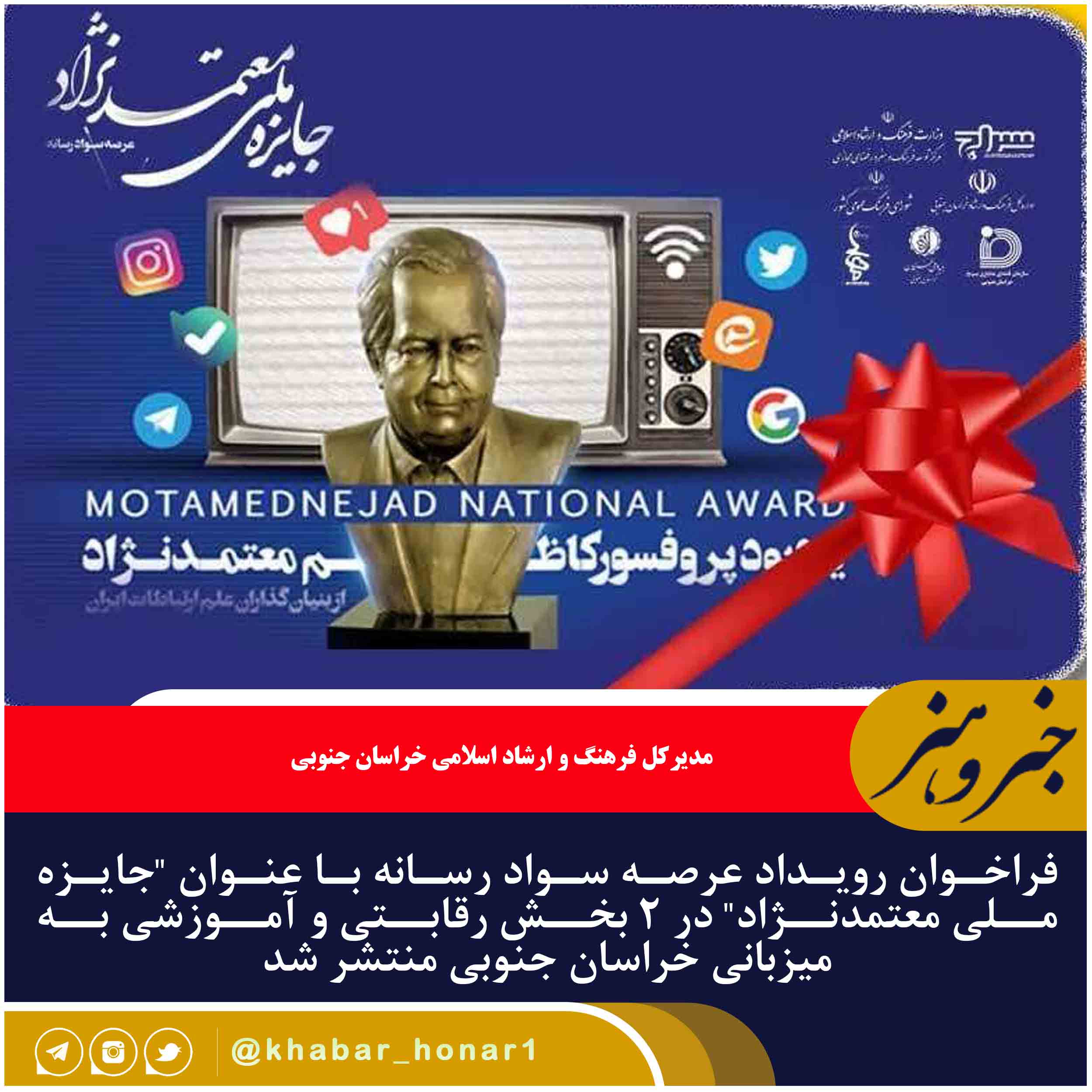 علی فرخنده گفت براساس این فراخوان منتشر شده ، رویداد ملی عرصه سواد رسانه (جایزه ملی معتمدنژاد) با همت اداره کل فرهنگ و ارشاد اسلامی استان و همکاری شورای فرهنگ عمومی کشور، بنیاد ملی نخبگان استان، موسسه مهنا، سازمان سراج و سازمان فضای مجازی بسیج خراسان جنوبی برگزار میشود.