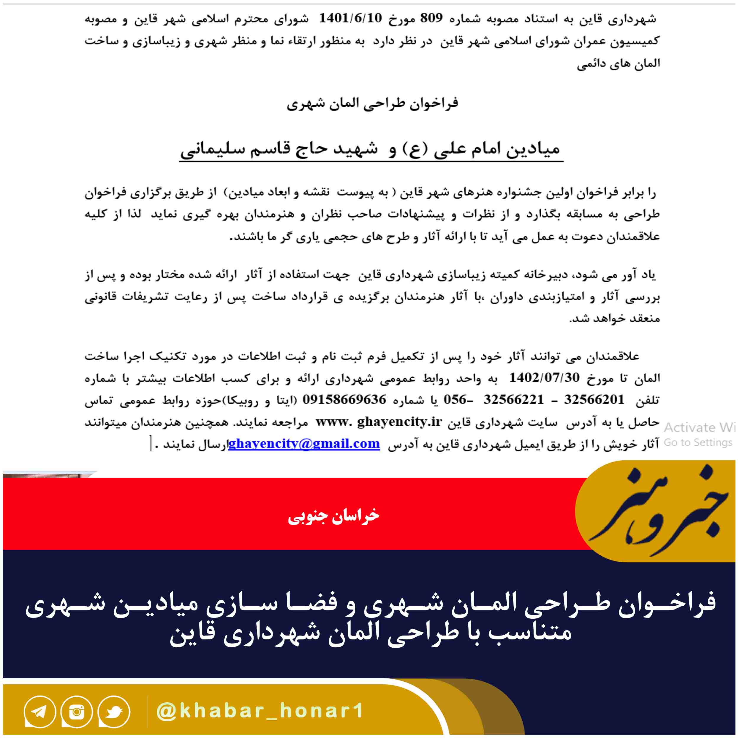 را برابر فراخوان اولین جشنواره هنرهای شهر قاین ( به پیوست نقشه و ابعاد میادین) از طریق برگزاری فراخوان طراحی به مسابقه بگذارد و از نظرات و پیشنهادات صاحب نظران و هنرمندان بهره گیری نماید لذا از کلیه علاقمندان دعوت به عمل می آید تا با ارائه آثار و طرح های حجمی یاری گر ما باشند.
