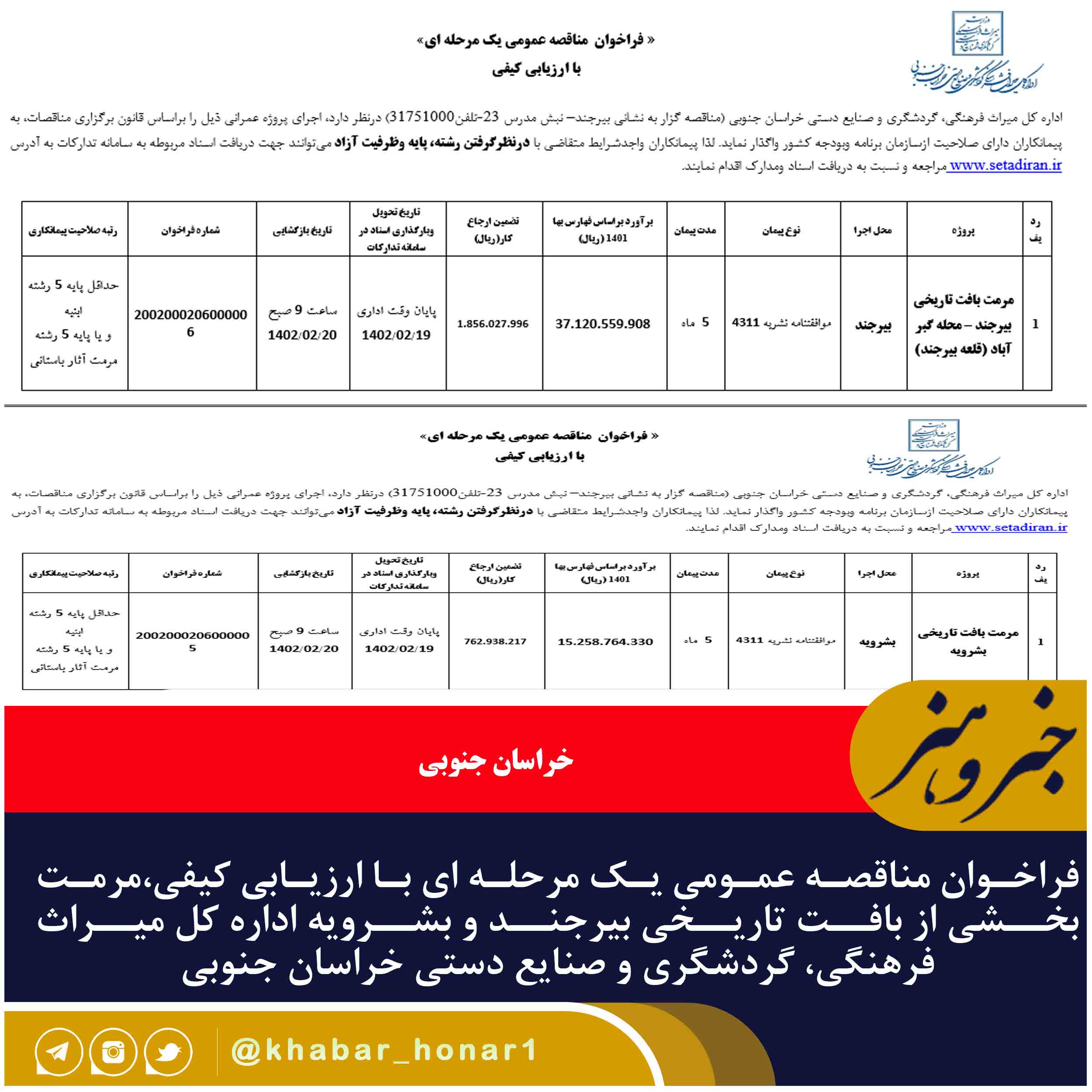 | ۱ | مرمت بافت تاریخی بیرجند – محله گبر آباد (قلعه بیرجند) | بیرجند | موافقتنامه نشریه ۴۳۱۱ | ۵ ماه | ۳۷.۱۲۰.۵۵۹.۹۰۸ | ۱.۸۵۶.۰۲۷.۹۹۶ | پایان وقت اداری ۱۹/۰۲/۱۴۰۲ | ساعت ۹ صبح ۲۰/۰۲/۱۴۰۲ | ۲۰۰۲۰۰۰۲۰۶۰۰۰۰۰۶ | حداقل پایه ۵ رشته ابنیه