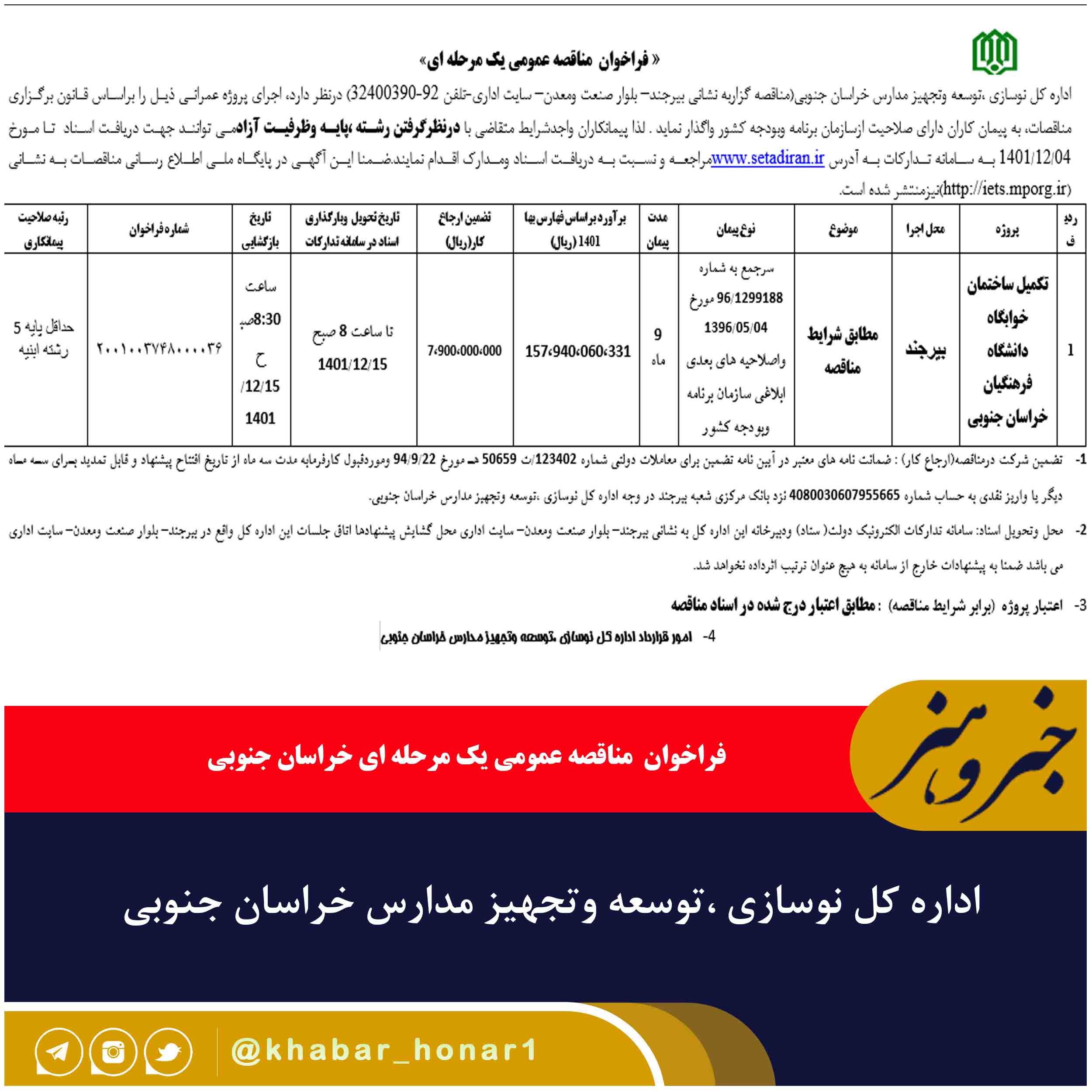 اداره کل نوسازی ،توسعه وتجهیز مدارس خراسان جنوبی(مناقصه گزاربه نشانی بیرجند– بلوار صنعت ومعدن– سایت اداری-تلفن ۹۲-۳۲۴۰۰۳۹۰) درنظر دارد، اجرای پروژه عمرانی ذیل را براساس قانون برگزاری مناقصات، به پیمان کاران دارای صلاحیت ازسازمان برنامه وبودجه کشور واگذار نماید . لذا پیمانکاران واجدشرایط متقاضی با درنظرگرفتن رشته ،پایه وظرفیت آزادمی توانند جهت دریافت اسناد تا مورخ ۰۴/۱۲/۱۴۰۱ به سامانه تدارکات به آدرس www.setadiran.irمراجعه و نسبت به دریافت اسناد ومدارک اقدام نمایند.ضمنا این آگهی در پایگاه ملی اطلاع رسانی مناقصات به نشانی (http://iets.mporg.ir)نیزمنتشر شده است.