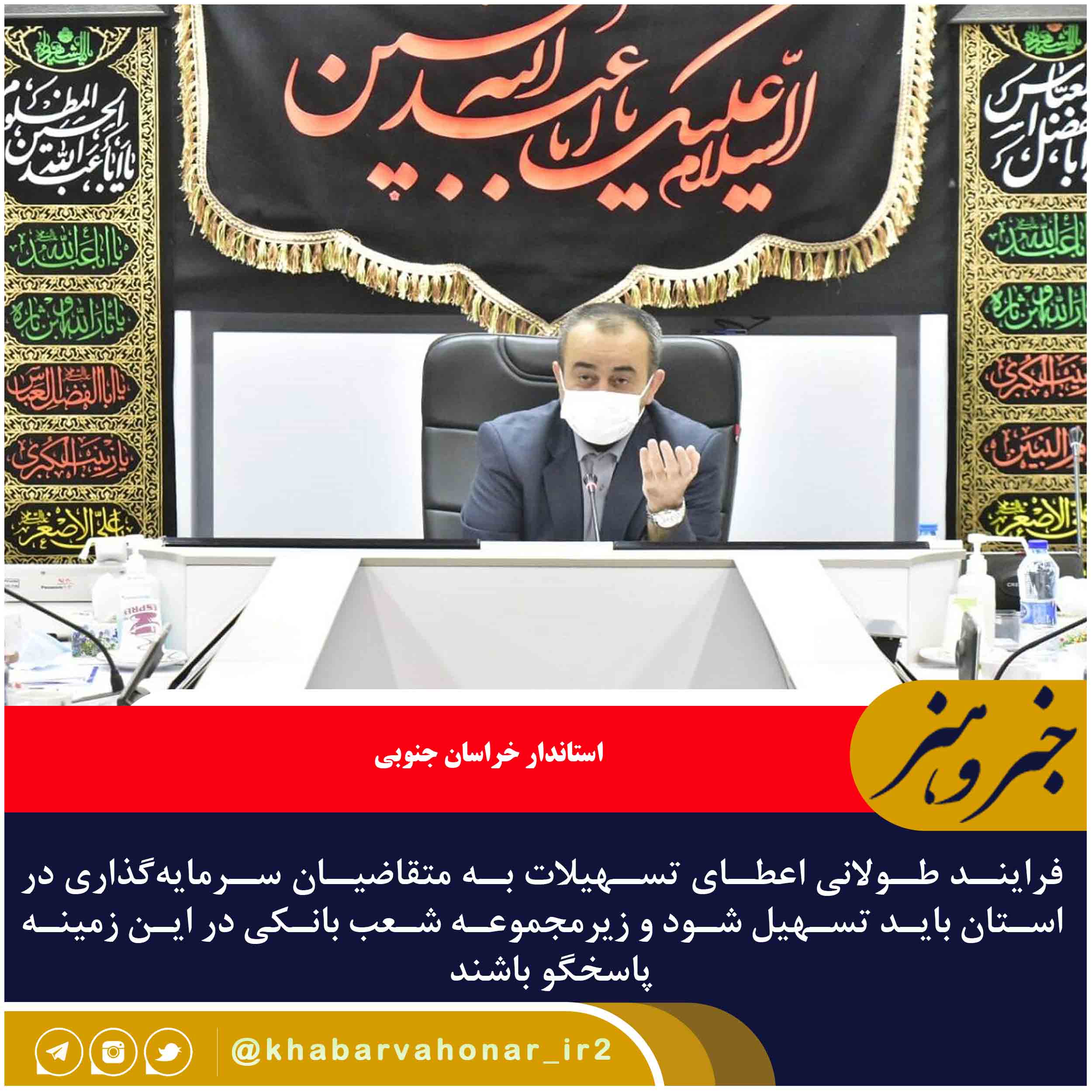 استاندار خراسان جنوبی گفت: فرایند طولانی اعطای تسهیلات به متقاضیان سرمایهگذاری در استان باید تسهیل شود و زیرمجموعه شعب بانکی در این زمینه پاسخگو باشند.