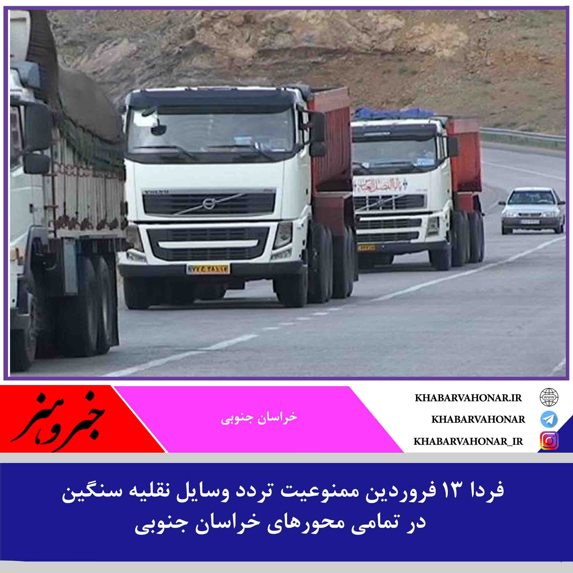 ?تردد وسایل نقلیه سنگین باربری در تمامی معابر و محورهای اصلی و فرعی خراسان جنوبی فردا شنبه ۱۳ فروردین ممنوع است.
