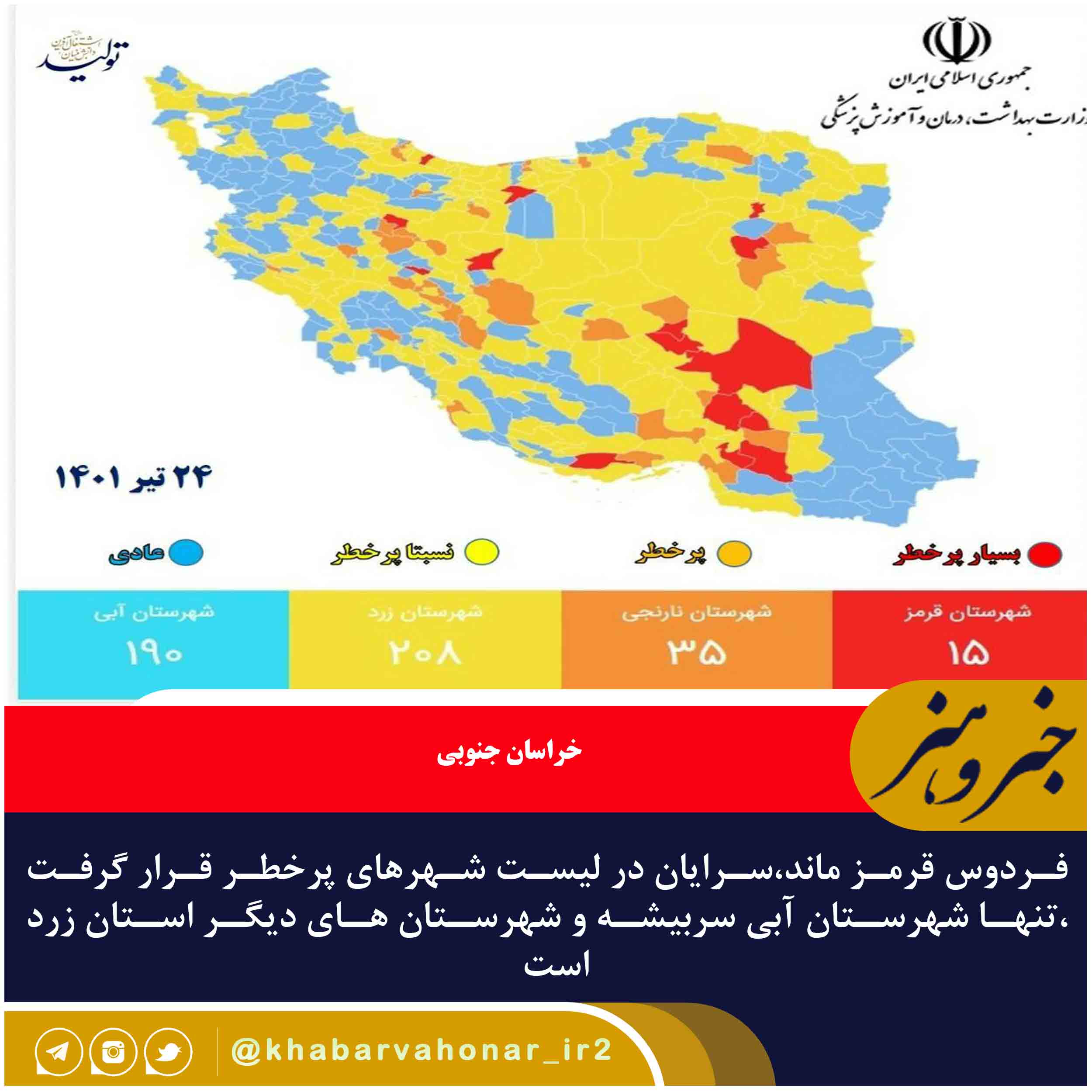 ?بر اساس آخرین به روز رسانی ها، در حال حاضر شهر فردوس در خراسان جنوبی به همراه ۱۴ شهر دیگر کشور در وضعیت قرمز قرار گرفته اند.