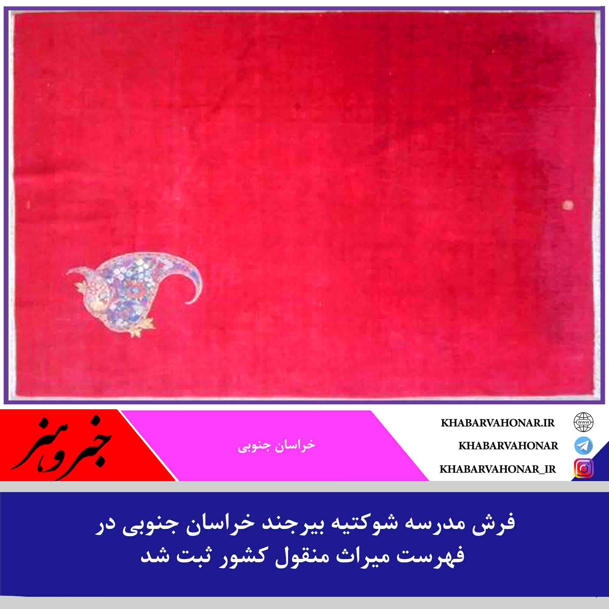 مسئول ثبت آثار منقول اداره کل میراث فرهنگی، گردشگری و صنایع دستی خراسان جنوبی اظهار کرد: فرش مدرسه شوکتیه بیرجند خراسان جنوبی در فهرست میراث منقول کشور ثبت شد.