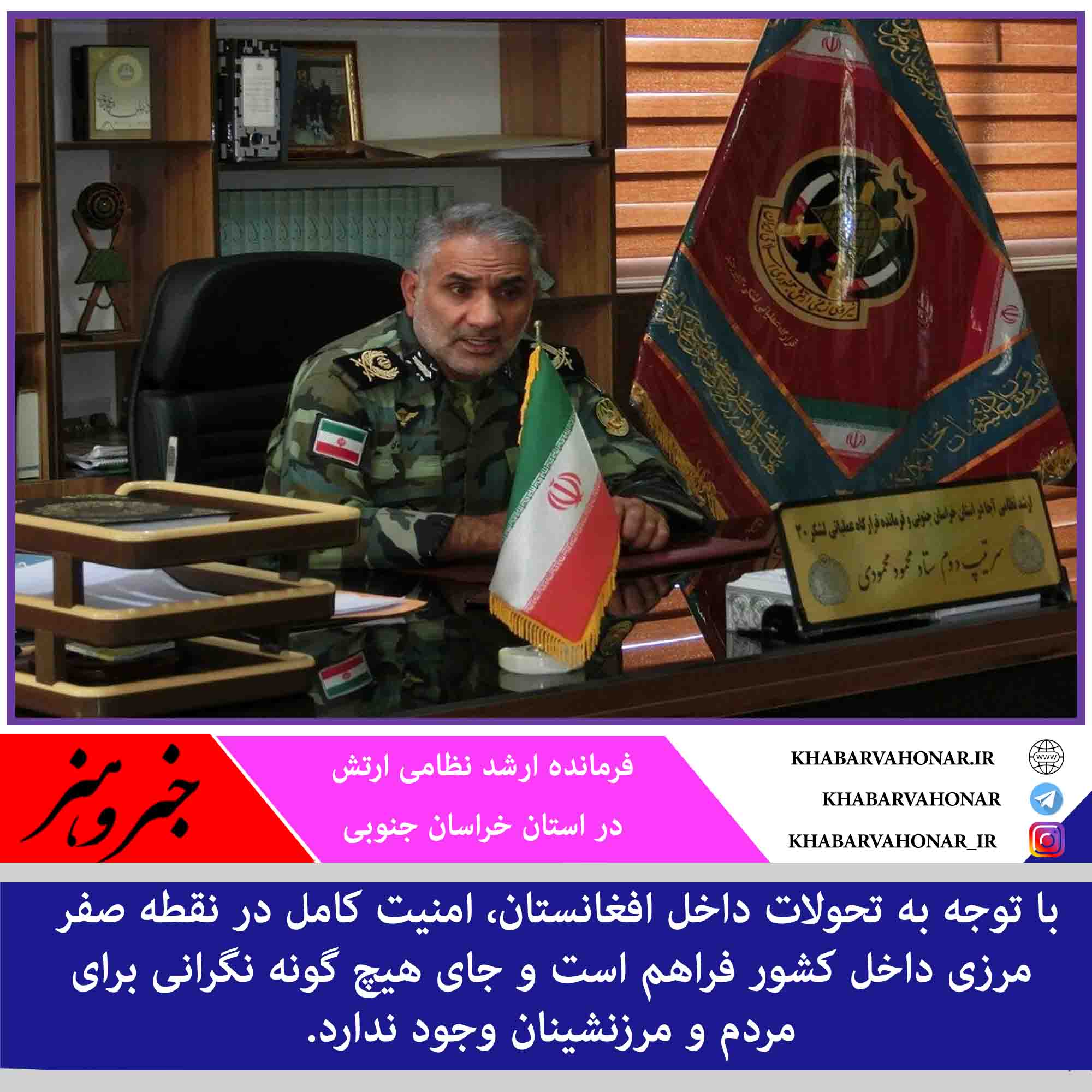 فرمانده ارشد نظامی ارتش در استان خراسان جنوبی گفت: با توجه به تحولات داخل افغانستان، امنیت کامل در نقطه صفر مرزی داخل کشور فراهم است و جای هیچ گونه نگرانی برای مردم و مرزنشینان وجود ندارد.