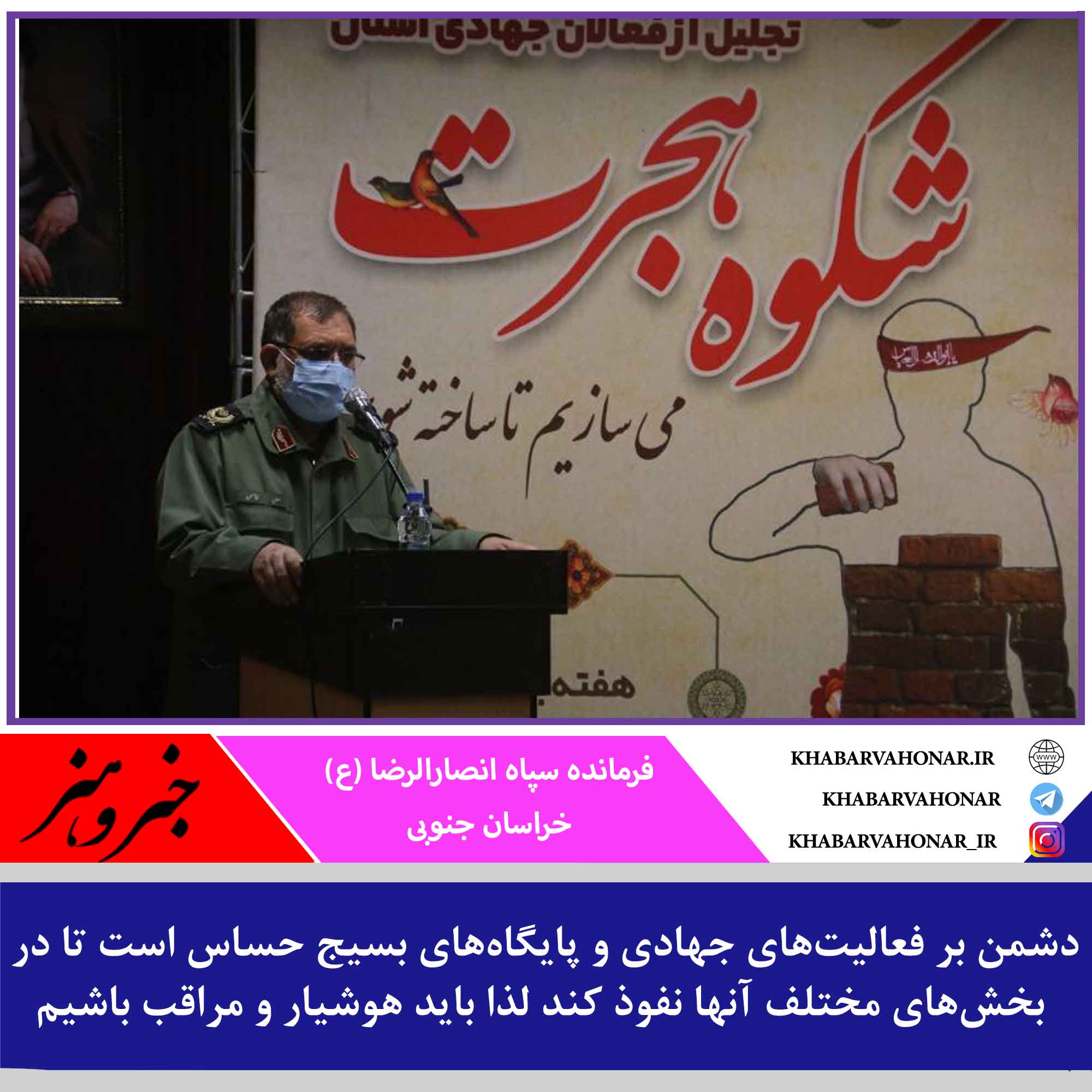 فرمانده سپاه انصارالرضا (ع) خراسان جنوبی گفت: دشمن بر فعالیتهای جهادی و پایگاههای بسیج حساس است تا در بخشهای مختلف آنها نفوذ کند لذا باید هوشیار و مراقب باشیم.