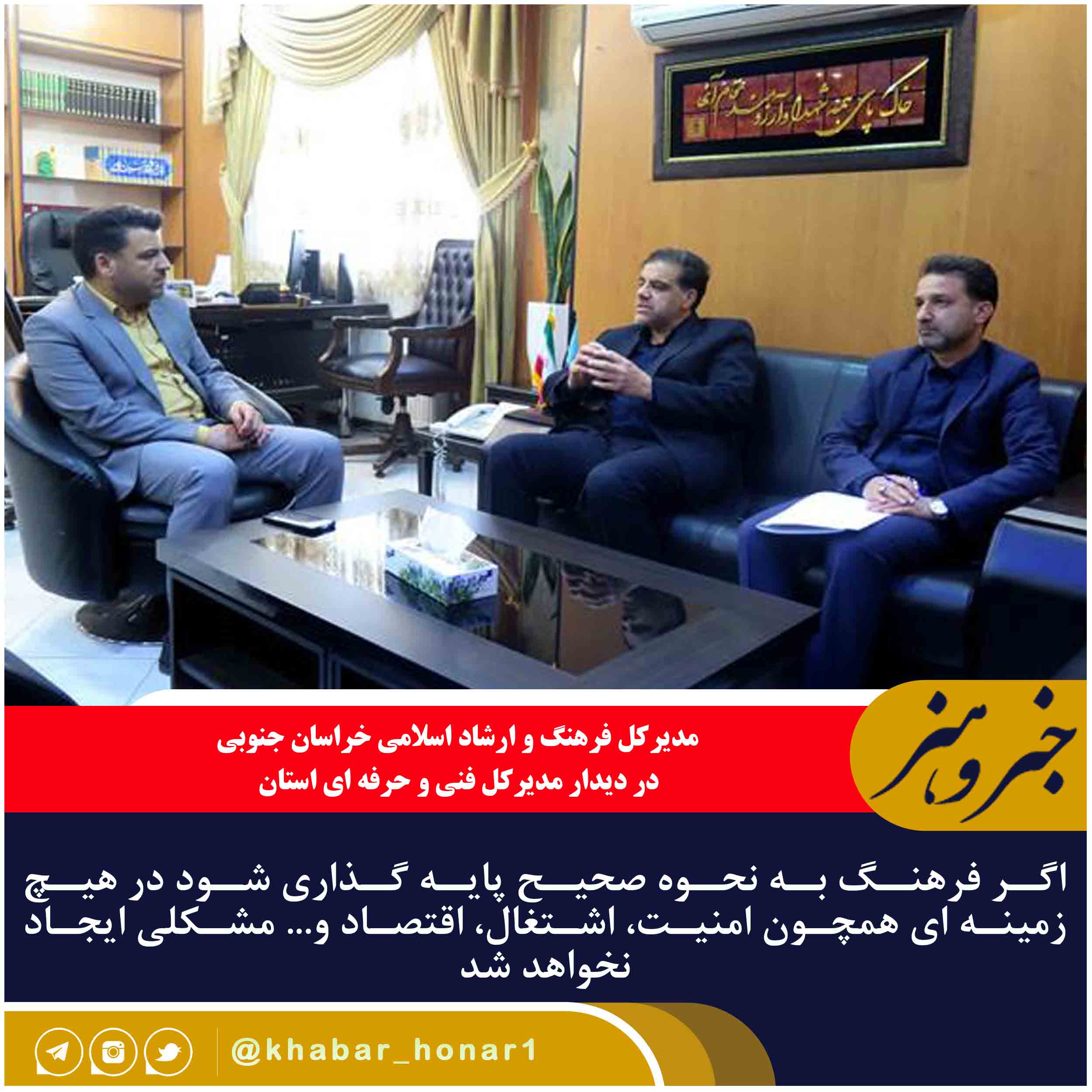 در دیدار مدیرکل فنی و حرفه ای خراسان جنوبی با مدیرکل فرهنگ و ارشاد اسلامی استان مطرح شد: فرهنگ پایه و اساس همه اقدامات و فعالیت ها می باشد. گفت: اساس و زیربنای همه فعالیت ها فرهنگ سازی می باشد و اگر فرهنگ به نحوه صحیح پایه گذاری شود در هیچ زمینه ای همچون امنیت، اشتغال، اقتصاد و… مشکلی ایجاد نخواهد شد.