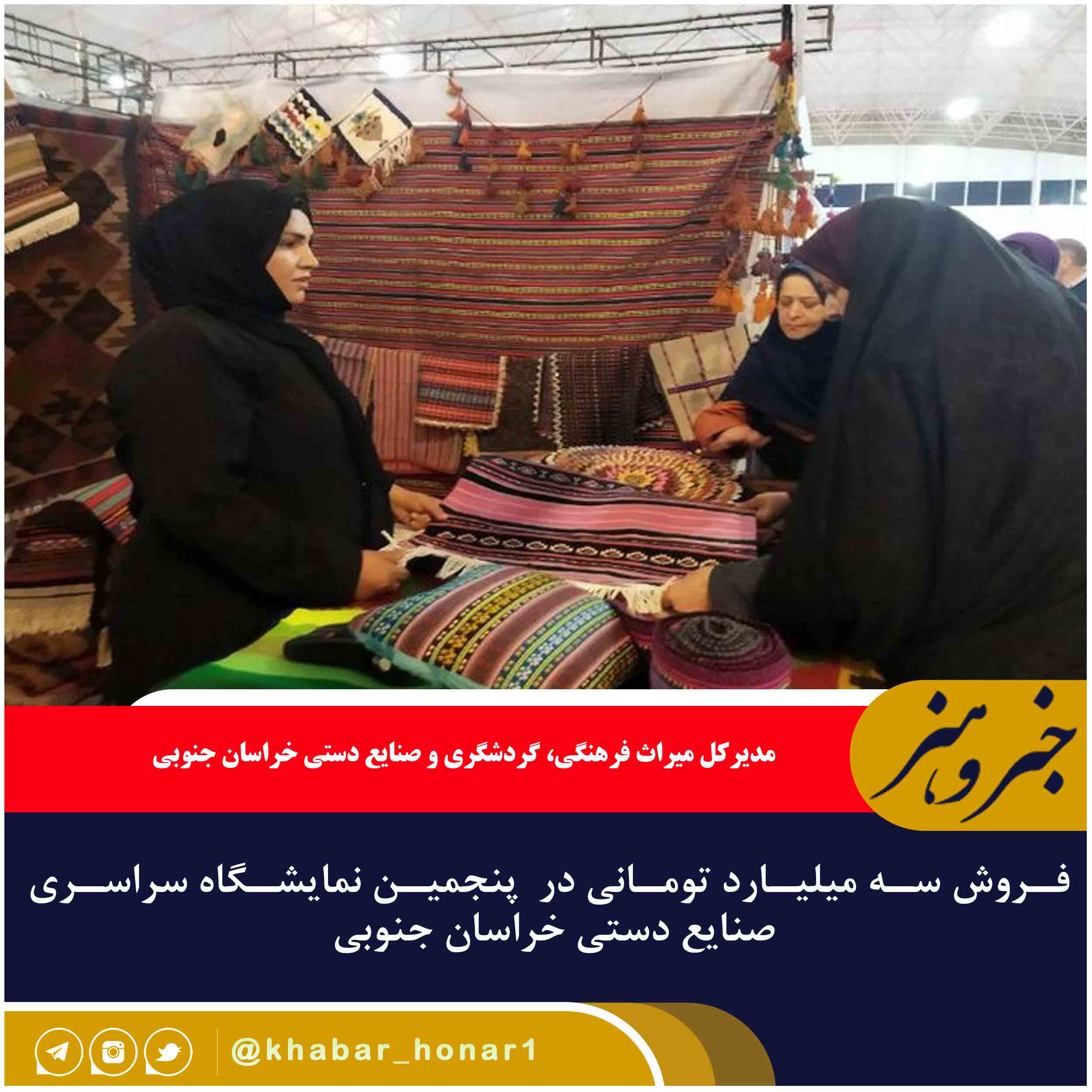 پنجمین نمایشگاه سراسری صنایع دستی خراسان جنوبی در حالی به کار خود پایان داد که هنرمندان و غرفهداران شرکت کننده در این نماشگاه موفق به فروش بیش از سه میلیارد تومان صنایع دستی شدند.پنجمین نمایشگاه سراسری صنایع دستی در خراسان جنوبی با حضور معاون صنایع دستی و هنرهای سنتی وزارت میراث فرهنگی، گردشگری و صنایع دستی، استاندار خراسان جنوبی و جمعی از مسوولان و صنعتگران از هفتم آذر ماه به مدت پنج روز در محل دائمی نمایشگاههای بینالمللی بیرجند گشایش یافت.