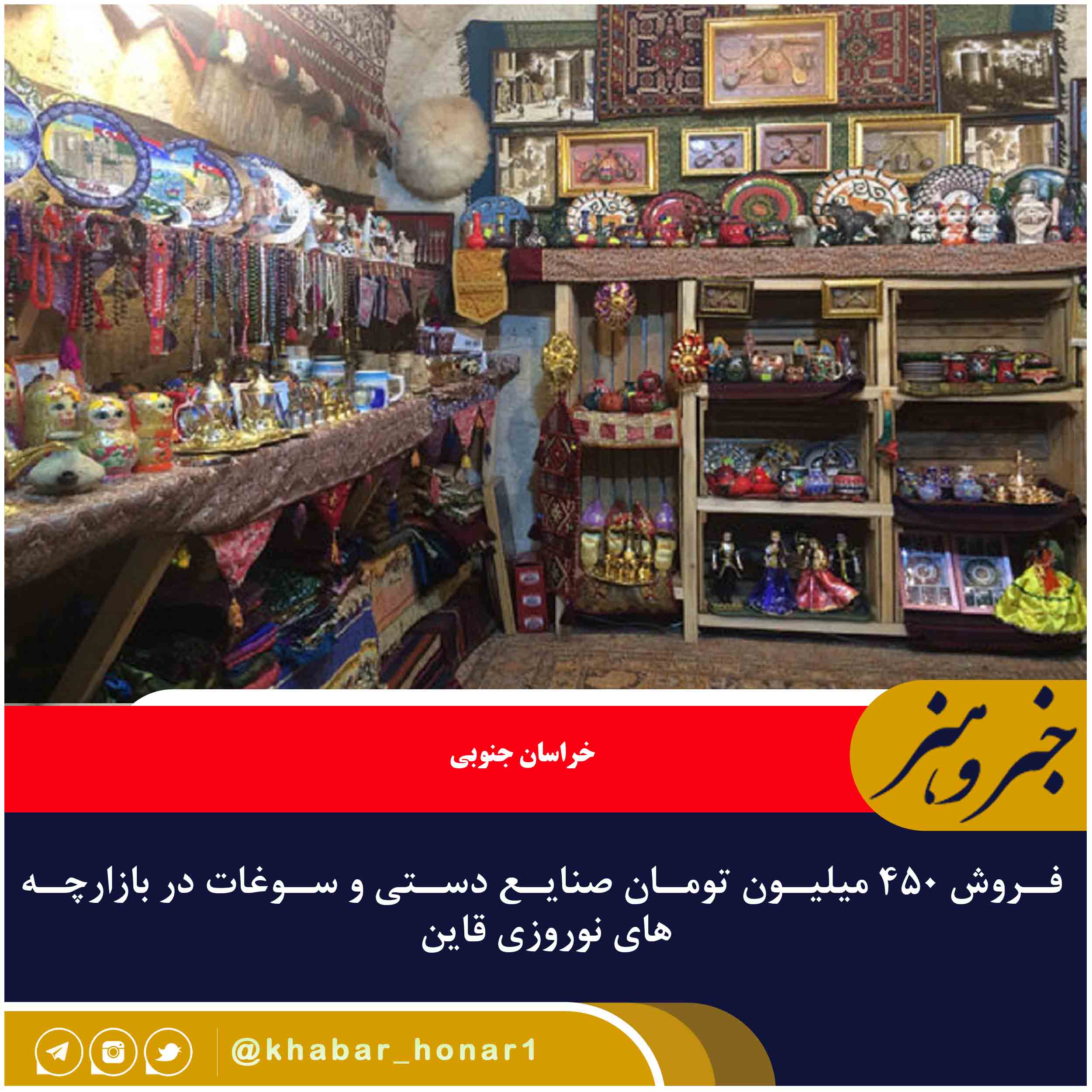 رئیس اداره میراث فرهنگی، صنایع دستی وگردشگری قاین از فروش ۴۵۰ میلیون تومان صنایع دستی و سوغات در بازارچه های نوروزی قاین خبر داد.