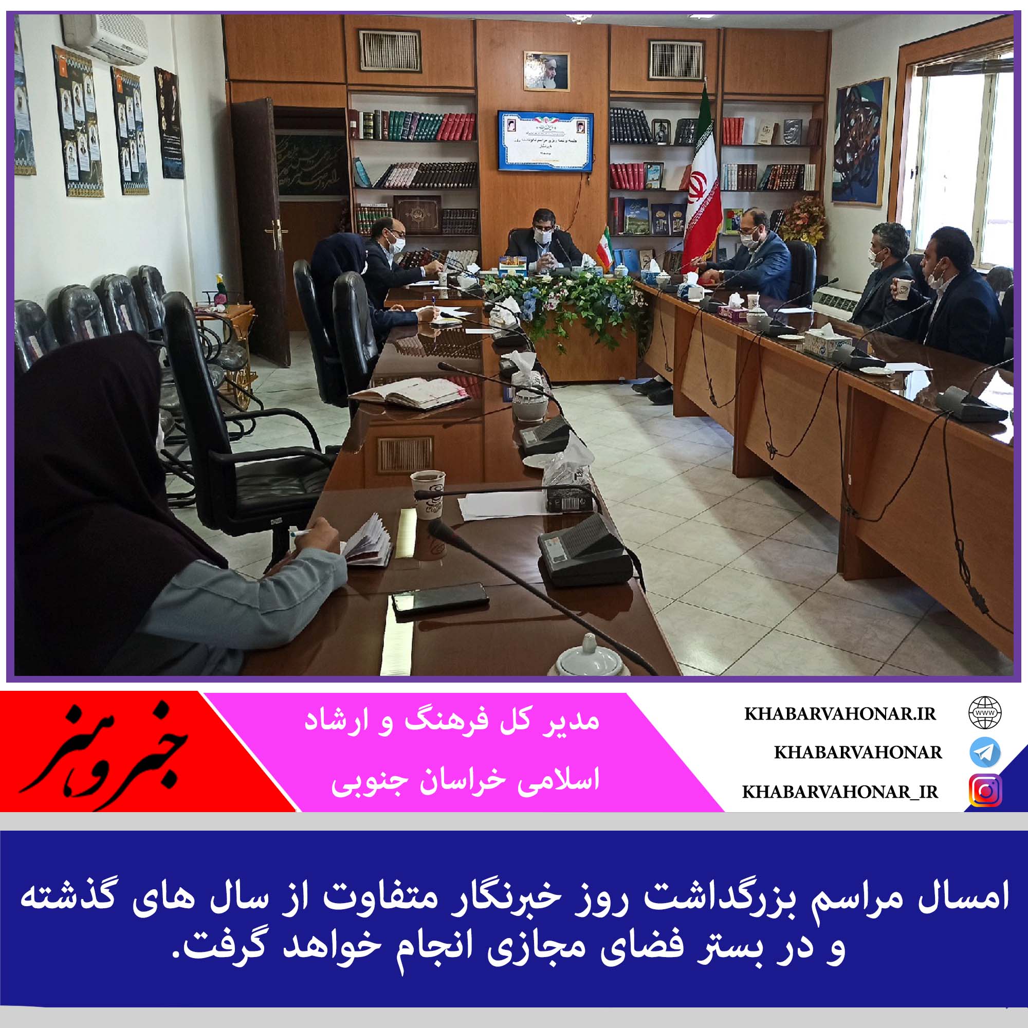 مدیر کل فرهنگ و ارشاد اسلامی خراسان جنوبی گفت: امسال مراسم بزرگداشت روز خبرنگار متفاوت از سال های گذشته و در بستر فضای مجازی انجام خواهد گرفت.جلسه برنامه ریزی مراسم نکوداشت روز خبرنگار یکشنبه ۱۲ مرداد ماه ۹۹ برگزار شد. ناصر نبی زاده در این جلسه عنوان کرد: با توجه به شیوع ویروس کرونا و اهمیت حفظ سلامت جامعه خبرنگاران و اصحاب رسانه مراسم به صورت غیر حضوری و از طریق ویدئو کنفرانس برگزار خواهد شد.