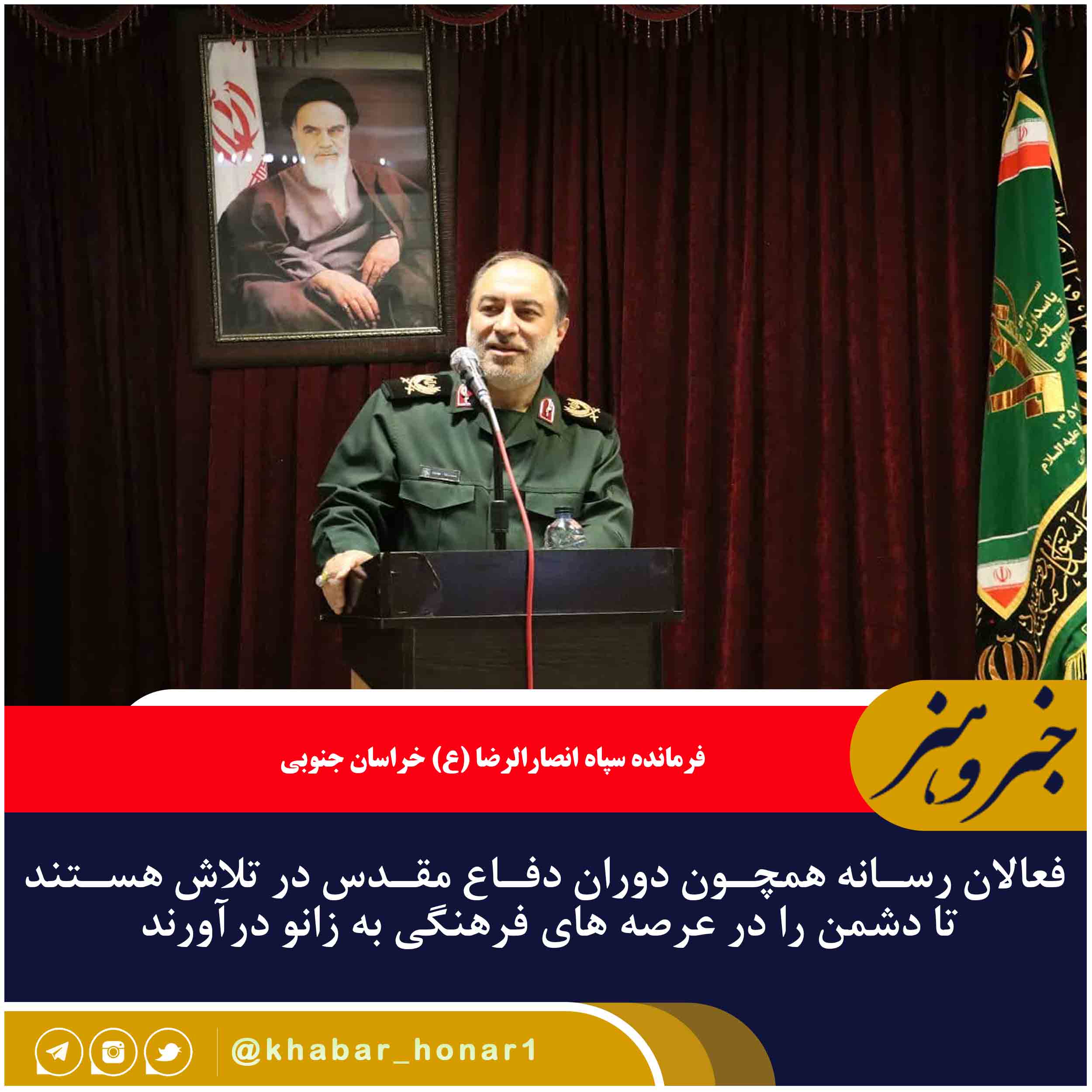 فرمانده سپاه انصارالرضا (ع) خراسان جنوبی ادامه داد: فعالان رسانه همچون دوران دفاع مقدس در تلاش هستند تا دشمن را در عرصه های فرهنگی به زانو درآورند و دشمن در این عرصه با توانمندی ها و امکانات بسیاری در حال فعالیت علیه جمهوری اسلامی است.