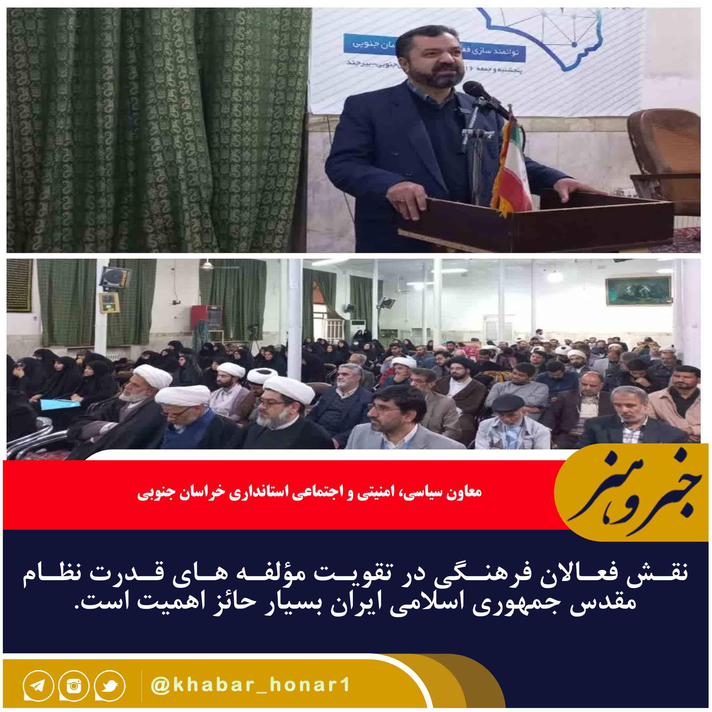 ?معاون سیاسی، امنیتی و اجتماعی استانداری خراسان جنوبی گفت: نقش فعالان فرهنگی در تقویت مؤلفه های قدرت نظام مقدس جمهوری اسلامی ایران بسیار حائز اهمیت است.