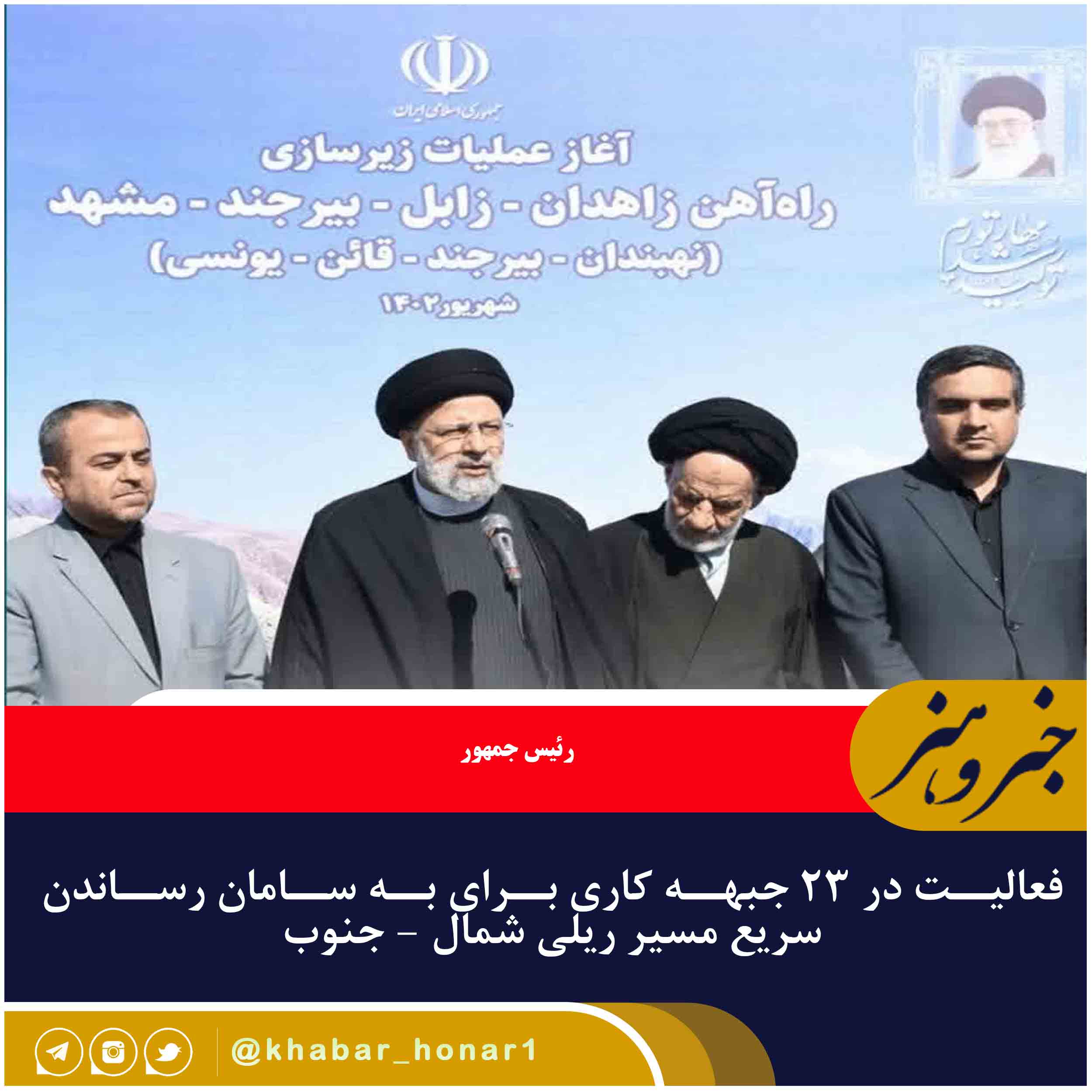سید ابراهیم رئیسی، رئیس جمهور صبح امروز (چهارشنبه) در مراسم آغاز عملیات زیرسازی راهآهن زاهدان – زابل – بیرجند – مشهد از فعالیت در ۲۳ جبهه کاری برای به سامان رساندن سریع مسیر ریلی شمال – جنوب خبر داد و گفت: تلاش داریم مسیر ریلی شمال به جنوب راهاندازی شود و سریعتر به سامان برسد.