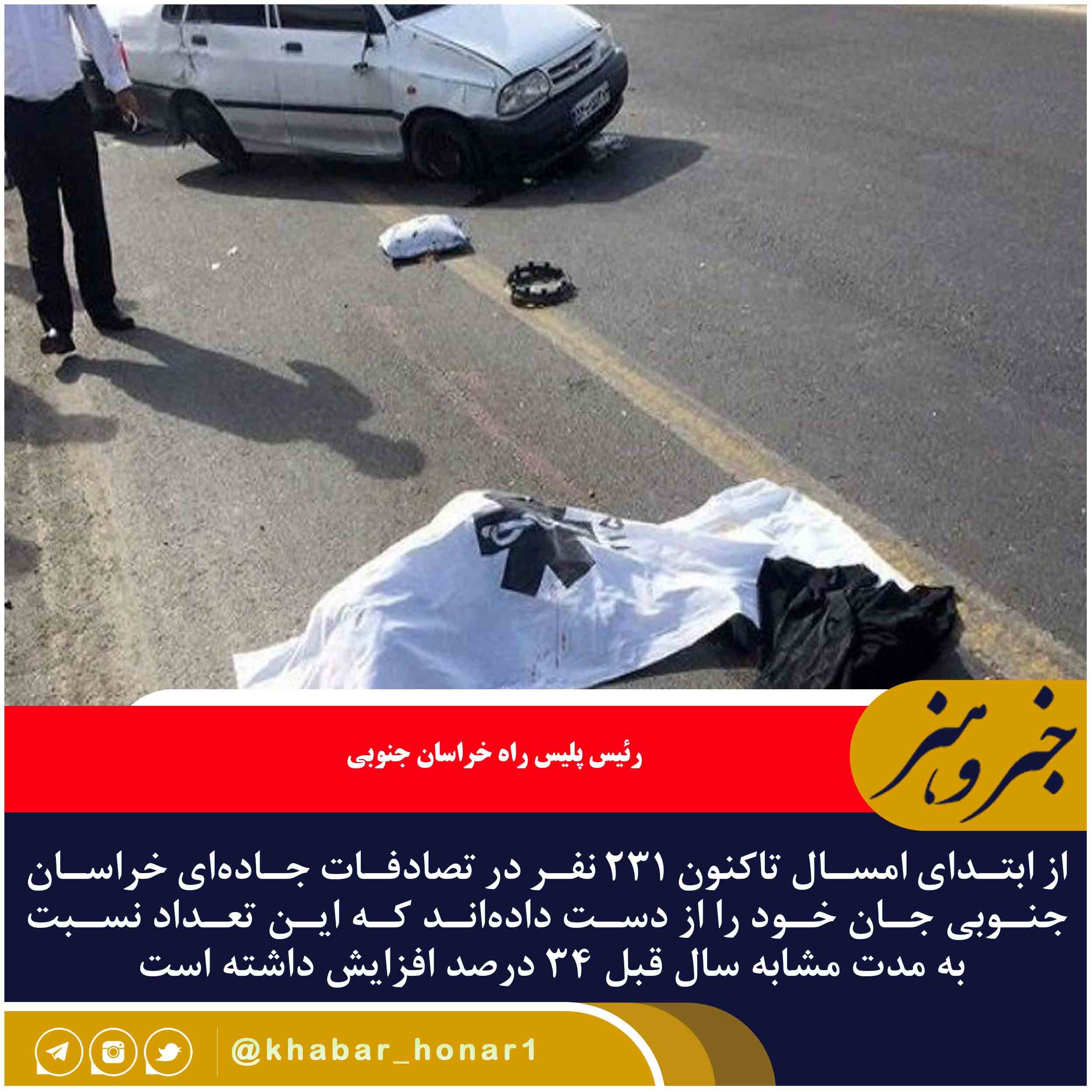 رئیس پلیس راه خراسان جنوبی گفت: از ابتدای امسال تاکنون ۲۳۱ نفر در تصادفات جادهای خراسان جنوبی جان خود را از دست دادهاند که این تعداد نسبت به مدت مشابه سال قبل ۳۴ درصد افزایش داشته است.