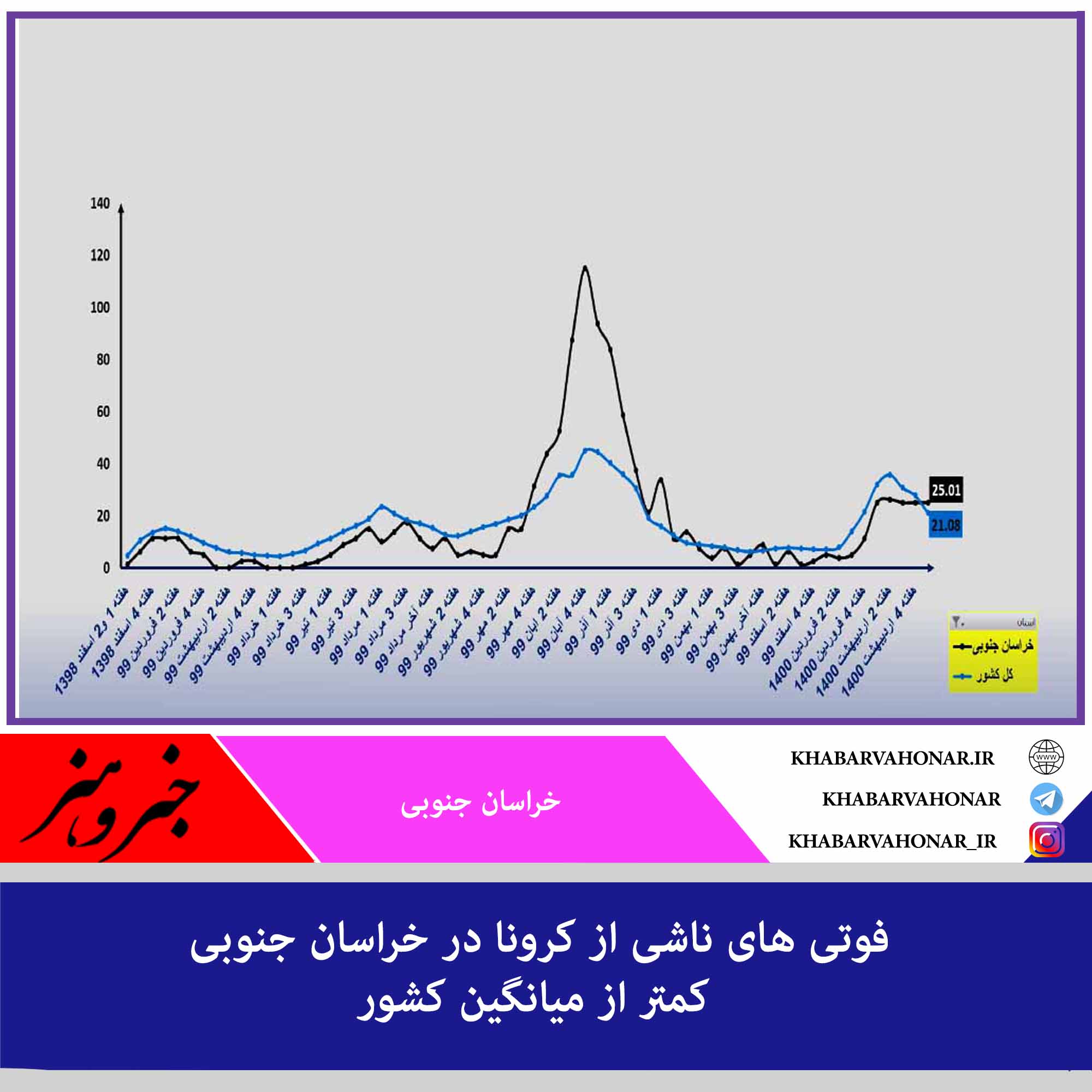 ?بر اساس آمار منتشر شده از سوی وزارت بهداشت، درمان و آموزش پزشکی، آمارفوتی های ناشی از کرونا در خراسان جنوبی در موج چهارم کرونا کمتر از میانگین کشور بوده، اما در موج سوم کرونا تعداد مواردفوت ناشی از کرونا در خراسان جنوبی فاصله زیادی با میانگین کشورداشته است.