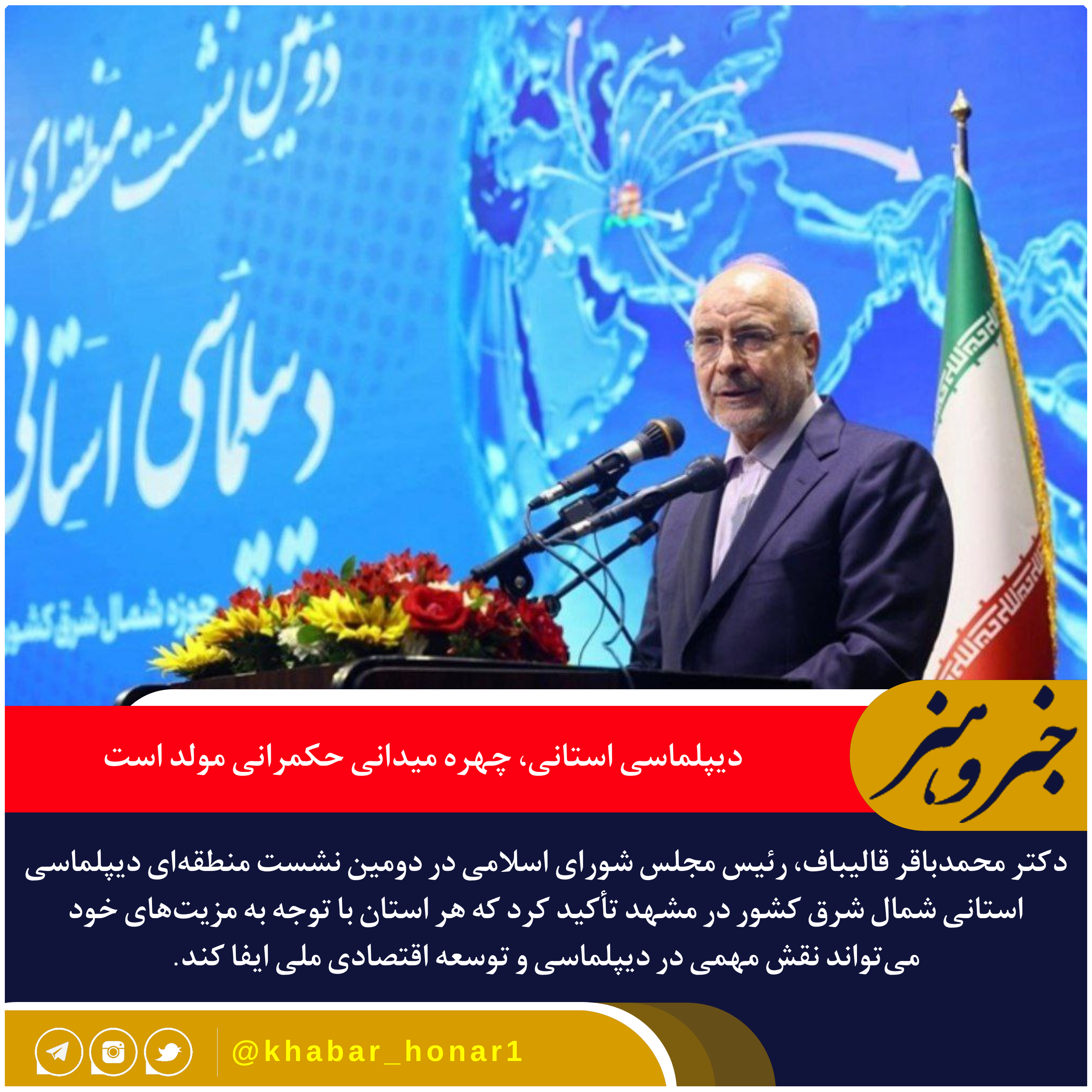 دکتر محمدباقر قالیباف، رئیس مجلس شورای اسلامی در دومین نشست منطقهای دیپلماسی استانی شمال شرق کشور در مشهد تأکید کرد که هر استان با توجه به مزیتهای خود میتواند نقش مهمی در دیپلماسی و توسعه اقتصادی ملی ایفا کند. وی دیپلماسی استانی را نقطه اتصال عقلانیت حکمرانی با میدان عمل دیپلماتیک دانست و آن را شاخص حکمرانی مولد در سطح بینالمللی معرفی کرد.