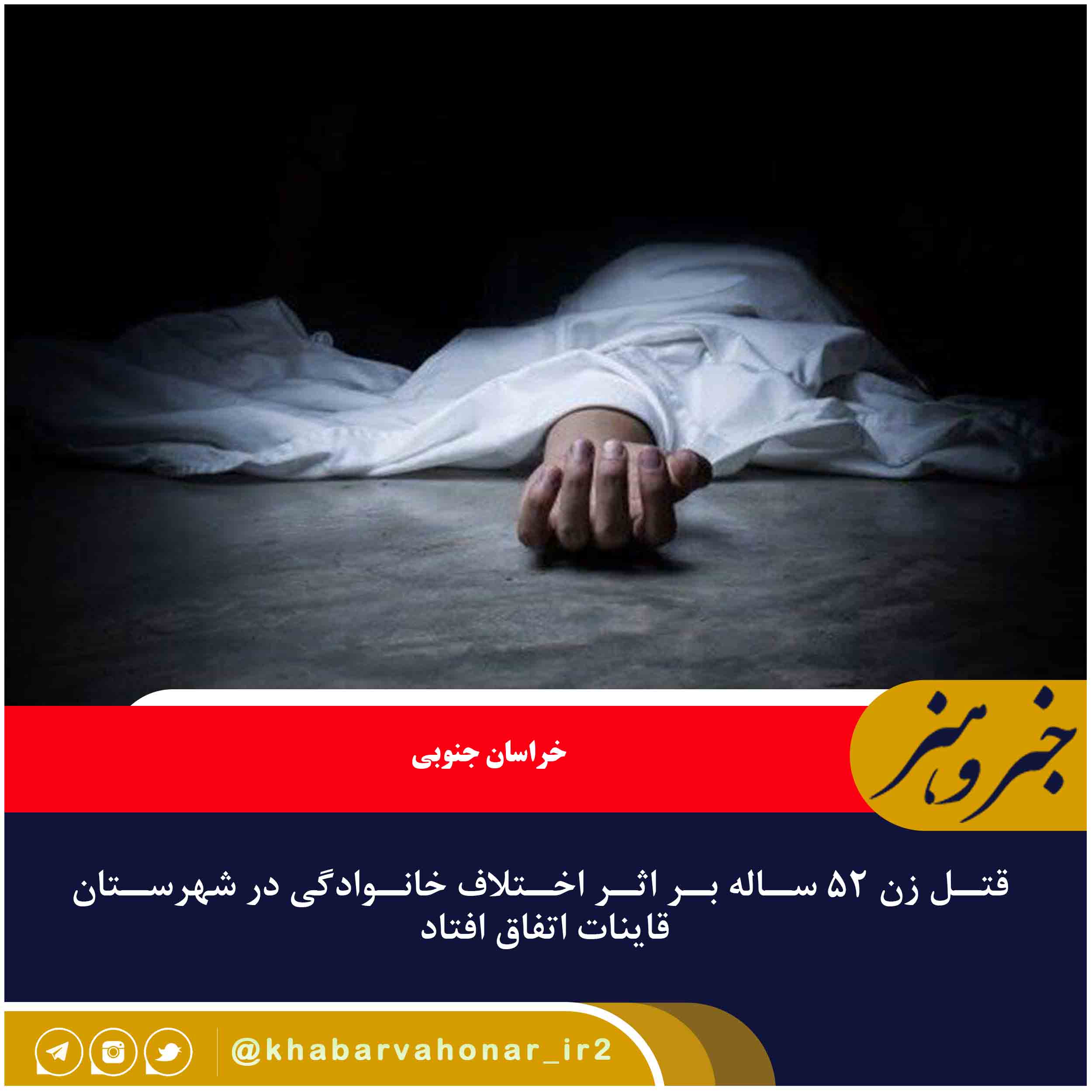 فرمانده انتظامی قاینات از وقوع قتل زن ۵۲ ساله به علت اختلافات خانوادگی در این شهرستان خبر داد.