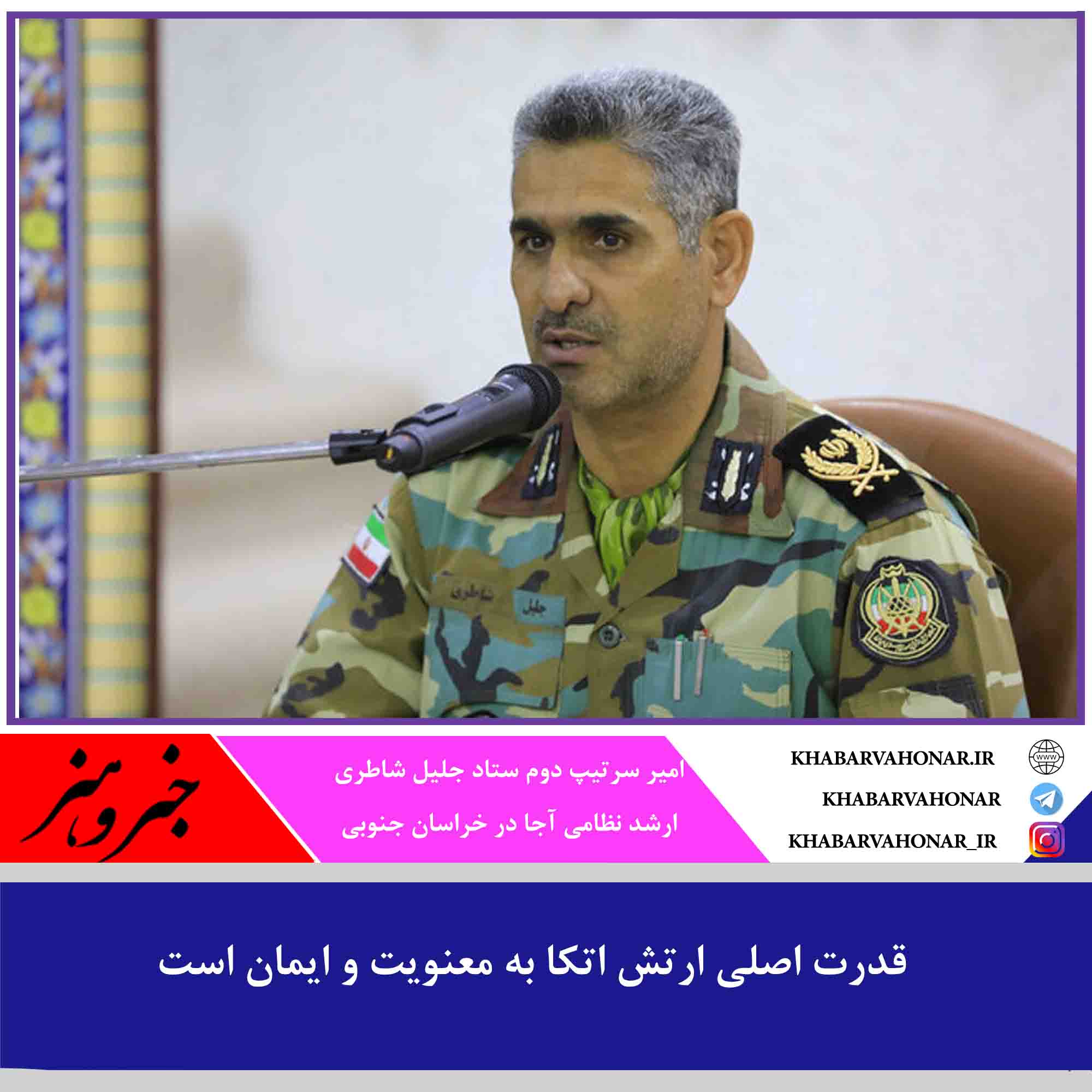 ارشد نظامی آجا در خراسان جنوبی گفت: قدرت اصلی ارتش اتکا به معنویت و ایمان است و بعد از ۴۳ سال هنوز از خط ولایت فقیه خارج نشده چون محوریت آن اسلامیت است.