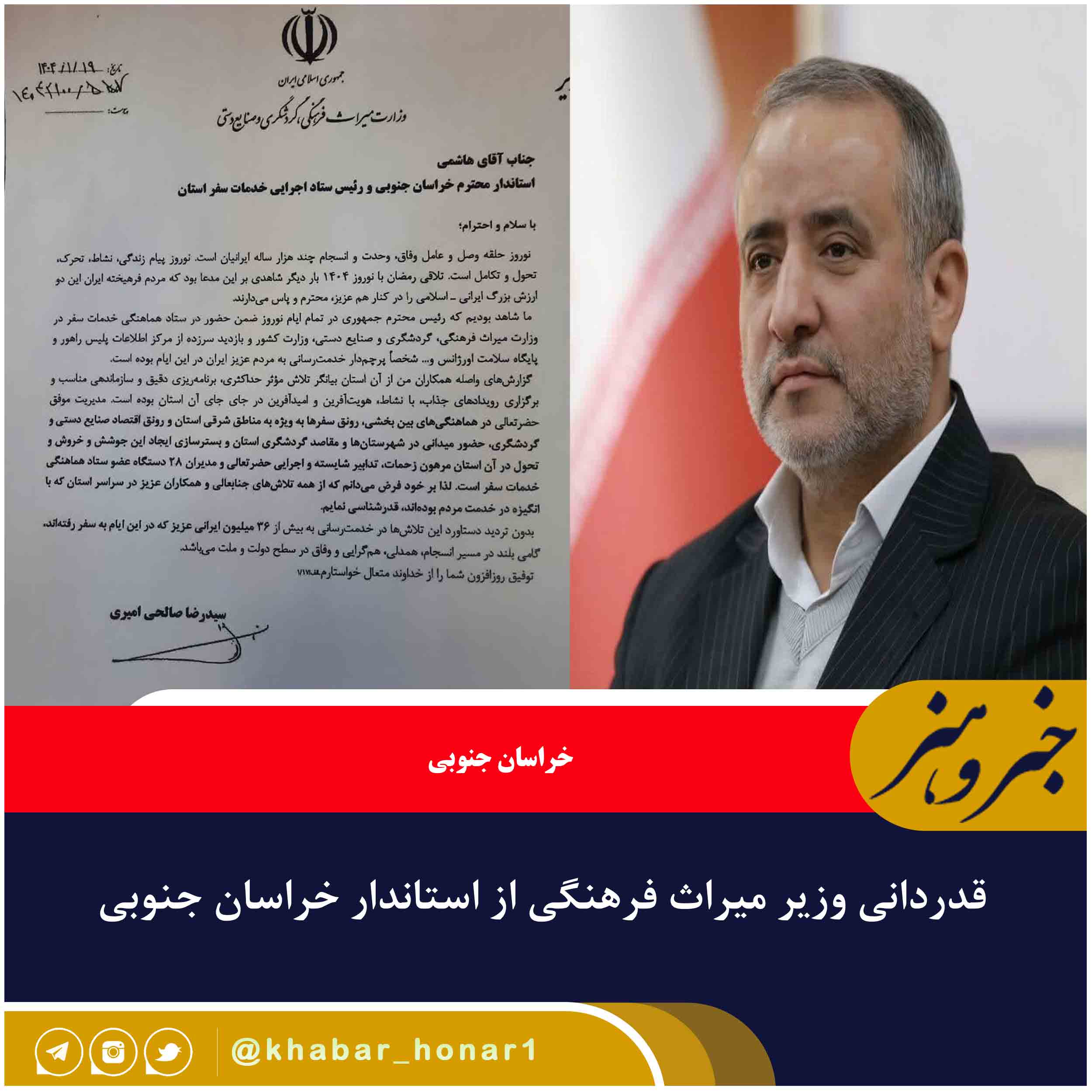 در متن تقدیرنامه وزیر میراث فرهنگی خطاب به استاندار خراسان جنوبی آمده است: نوروز حلقه وصل و عامل وفاق وحدت و انسجام چند هزار ساله ایرانیان است، نوروز پیام زندگی، نشاط، تحرک، تحول و تکامل است.