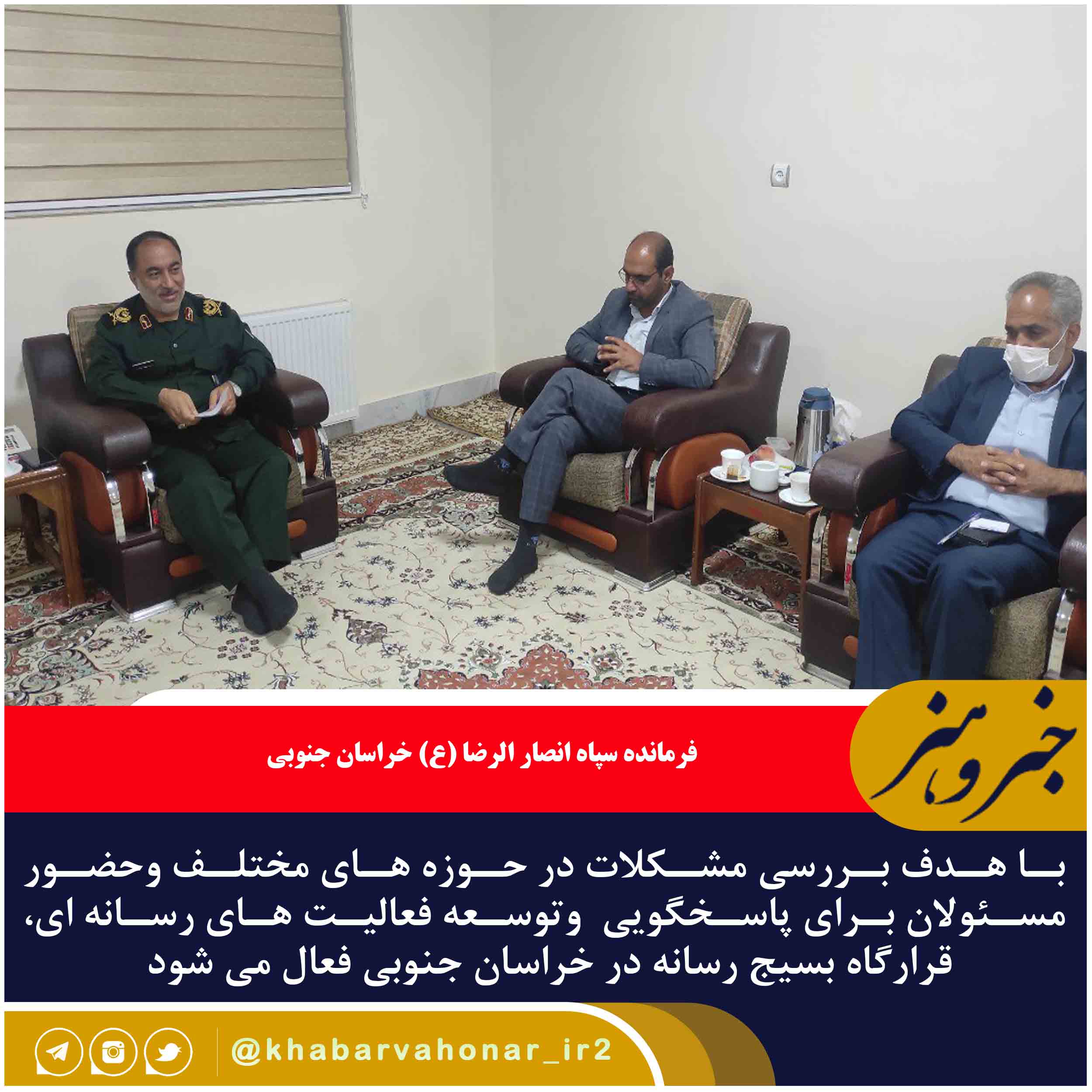 فرمانده سپاه انصار الرضا (ع) خراسان جنوبی گفت: با هدف بررسی مشکلات در حوزه های مختلف وحضور مسئولان برای پاسخگویی وتوسعه فعالیت های رسانه ای، قرارگاه بسیج رسانه در خراسان جنوبی فعال می شود.