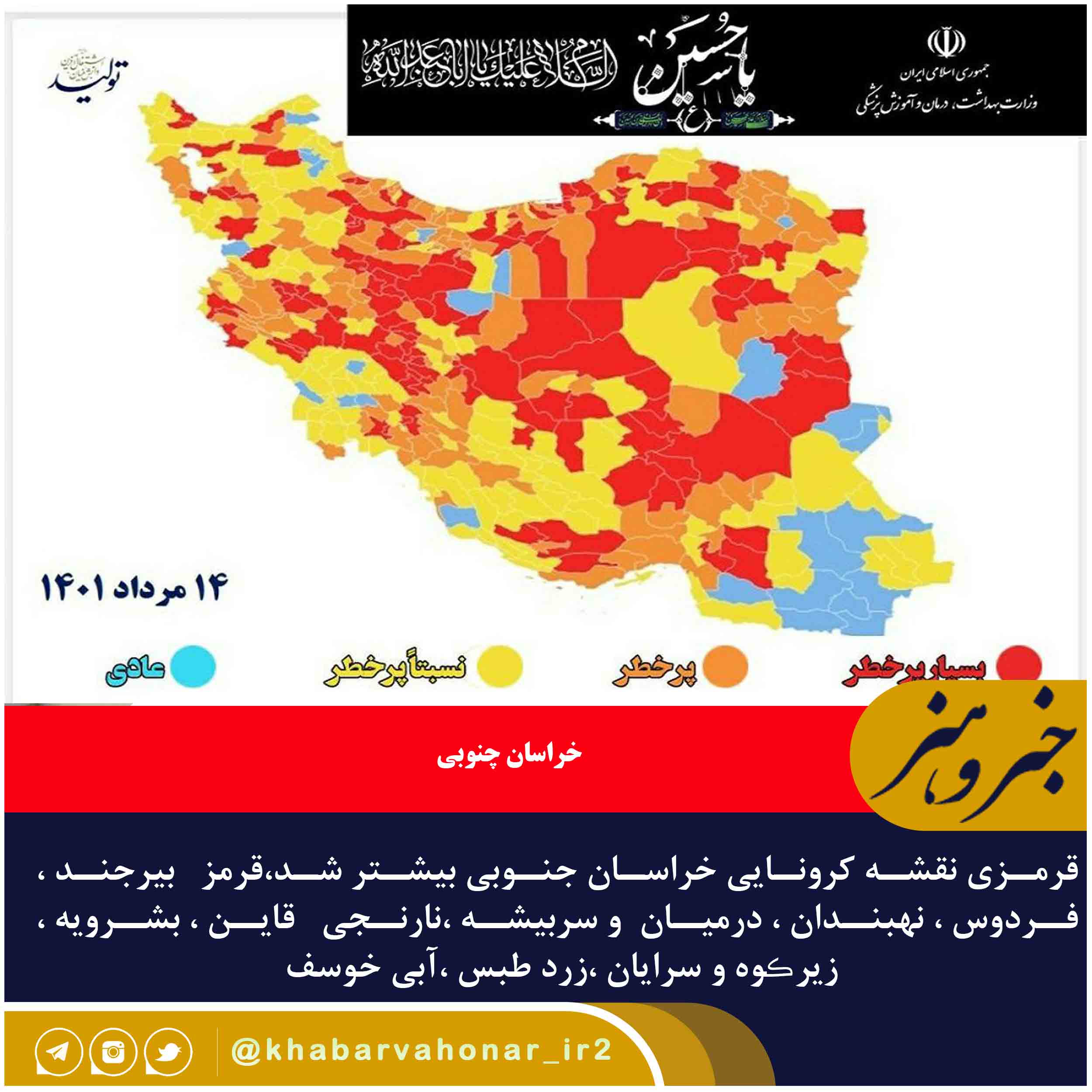 بر اساس آخرین بروزرسانی نقشه کرونایی کشور که مورد تأیید وزارت بهداشت، درمان و آموزش  پزشکی است، ۵ شهرستان بیرجند، درمیان، سربیشه، فردوس و نهبندان در وضعیت قرمز قرار گرفتند.