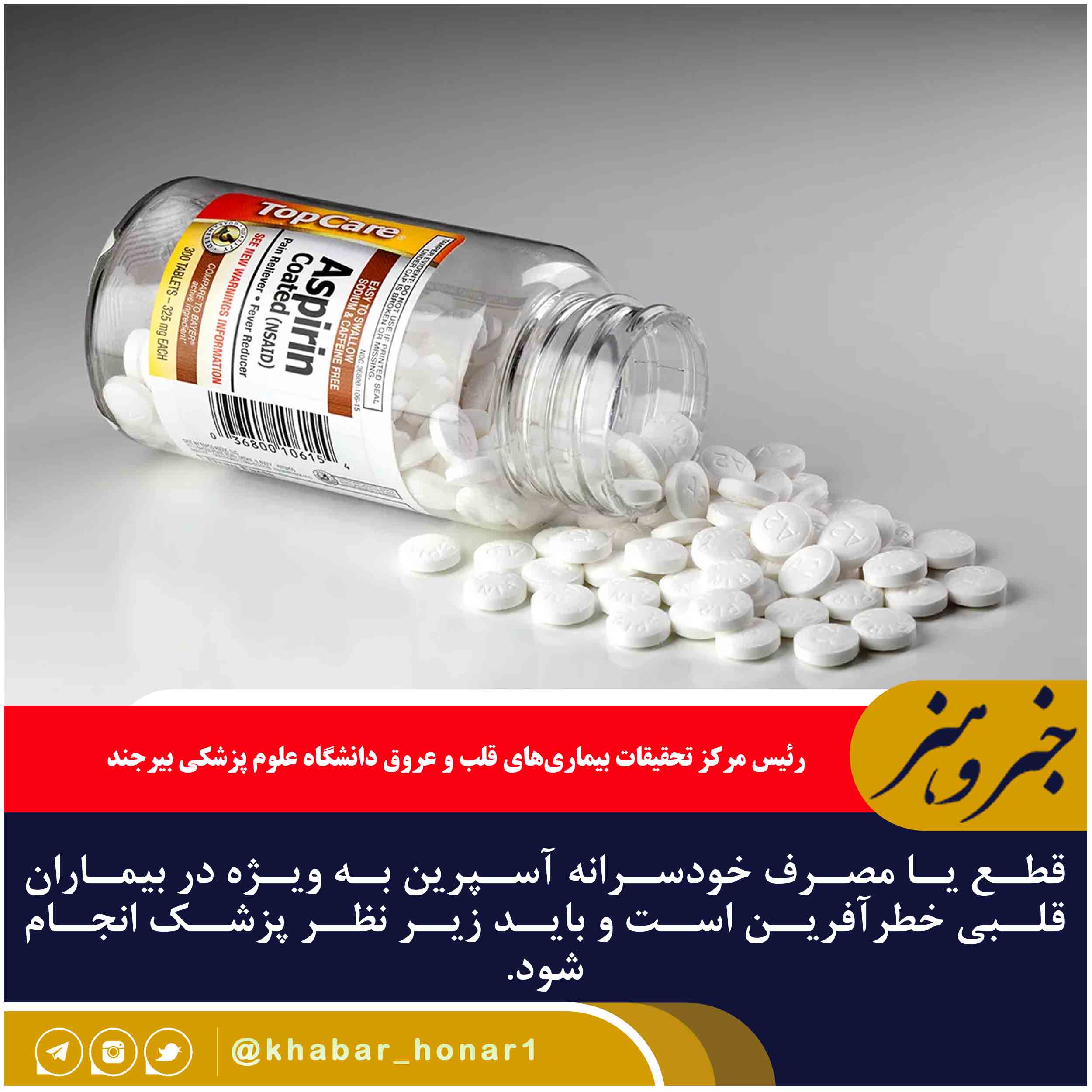 رئیس مرکز تحقیقات بیماریهای قلب و عروق دانشگاه علوم پزشکی بیرجند گفت: قطع یا مصرف خودسرانه آسپرین به ویژه در بیماران قلبی خطرآفرین است و باید زیر نظر پزشک انجام شود.