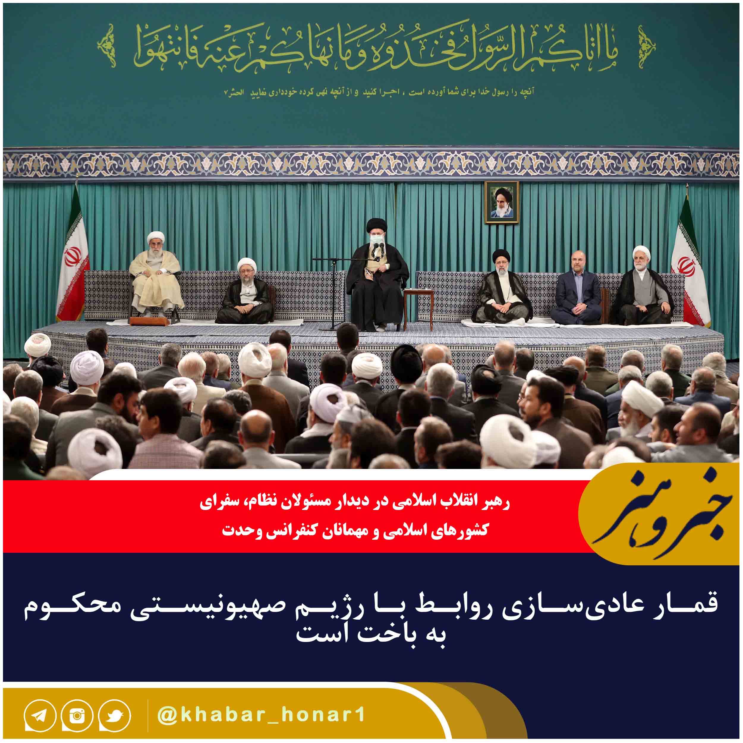 در خجسته سالروز ولادت با سعادت حضرت ختمی مرتبت محمد مصطفی(ص) و حضرت امام جعفر صادق(ع)، رهبر انقلاب اسلامی در دیدار مسئولان نظام، سفرای کشورهای اسلامی، مهمانان کنفرانس وحدت و جمعی از قشرهای مختلف مردم، احساس خطر قدرتهای زورگو از تعالیم قرآن کریم را علت طراحیهای آنها برای اهانت به این کتاب الهی خواندند و با تأکید بر اینکه راه مقابله با دخالت آمریکا و قدرتهای زورگو، اتحاد کشورهای اسلامی و اتخاذ خط مشی واحد در مسائل اساسی است، گفتند: قمار عادیسازی روابط با رژیم صهیونیستی مانند شرطبندی روی اسب بازنده، محکوم به باخت است چرا که نهضت فلسطین امروز سرزندهتر و آمادهتر از همیشه است و رژیم غاصب، رفتنی و در حال مرگ است.