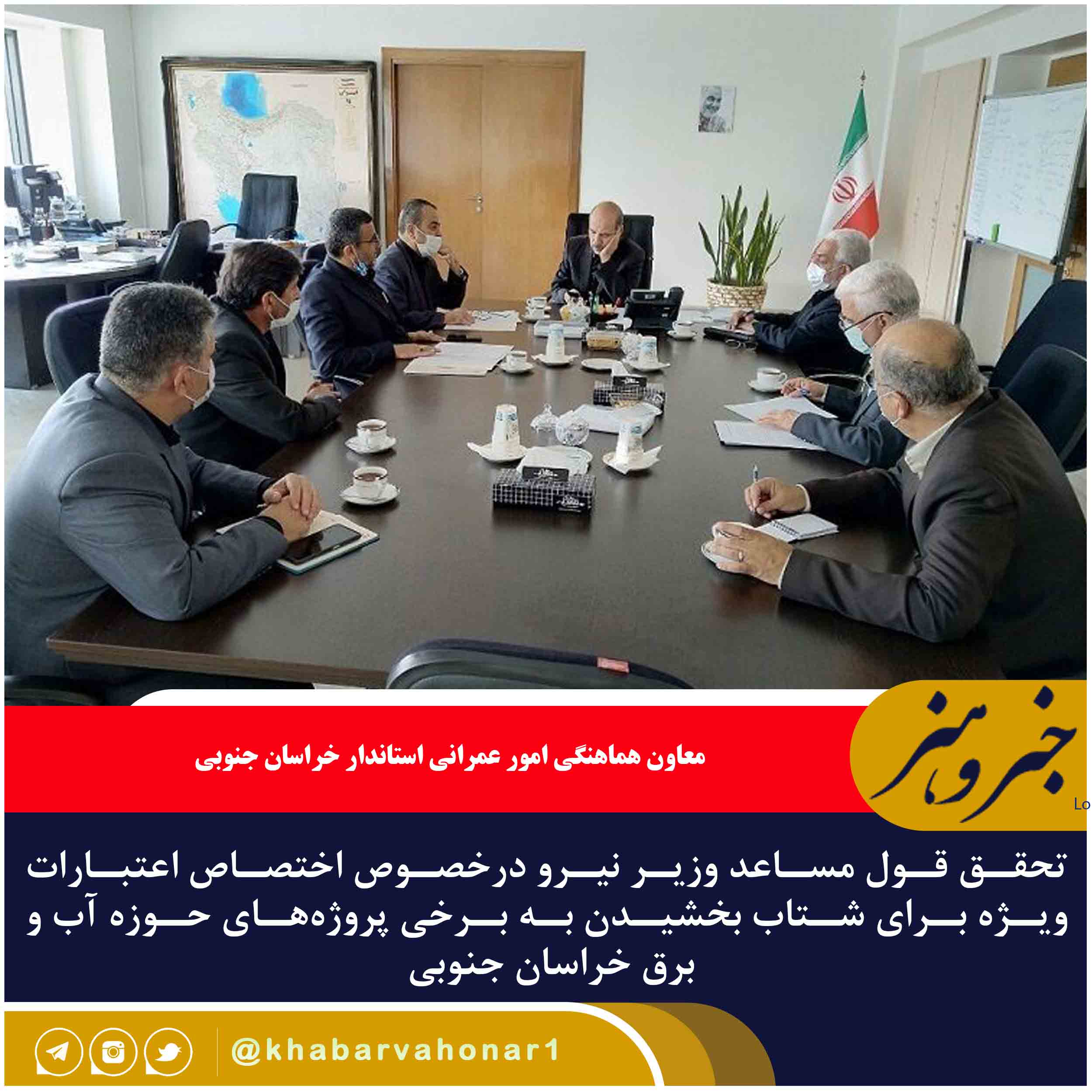 معاون هماهنگی امور عمرانی استاندار خراسان جنوبی از تحقق قول مساعد وزیر نیرو درخصوص اختصاص اعتبارات ویژه برای شتاب بخشیدن به برخی پروژه‌های حوزه آب و برق خراسان جنوبی خبر داد.