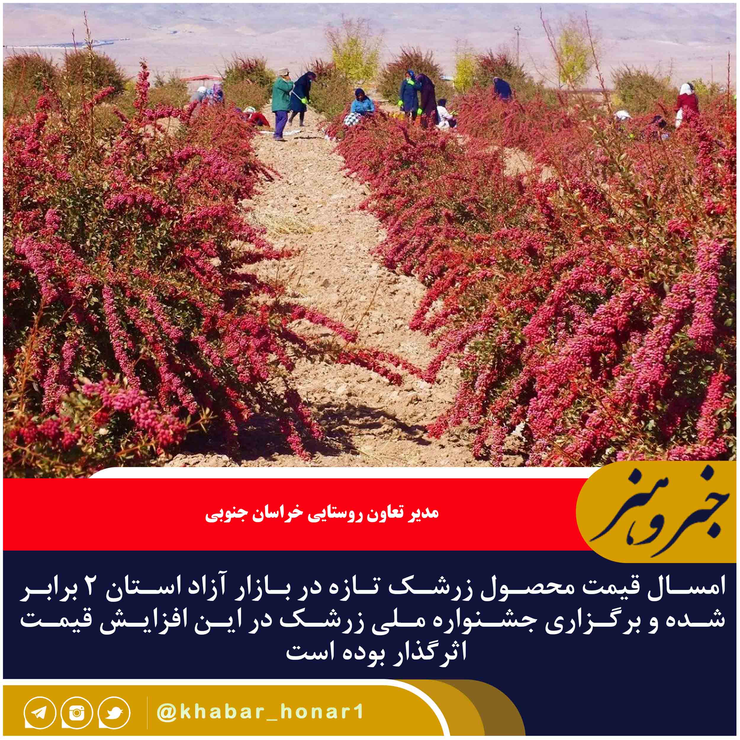 مدیر تعاون روستایی خراسان جنوبی گفت: امسال قیمت محصول زرشک تازه در بازار آزاد استان ۲ برابر شده و برگزاری جشنواره ملی زرشک در این افزایش قیمت اثرگذار بوده است.