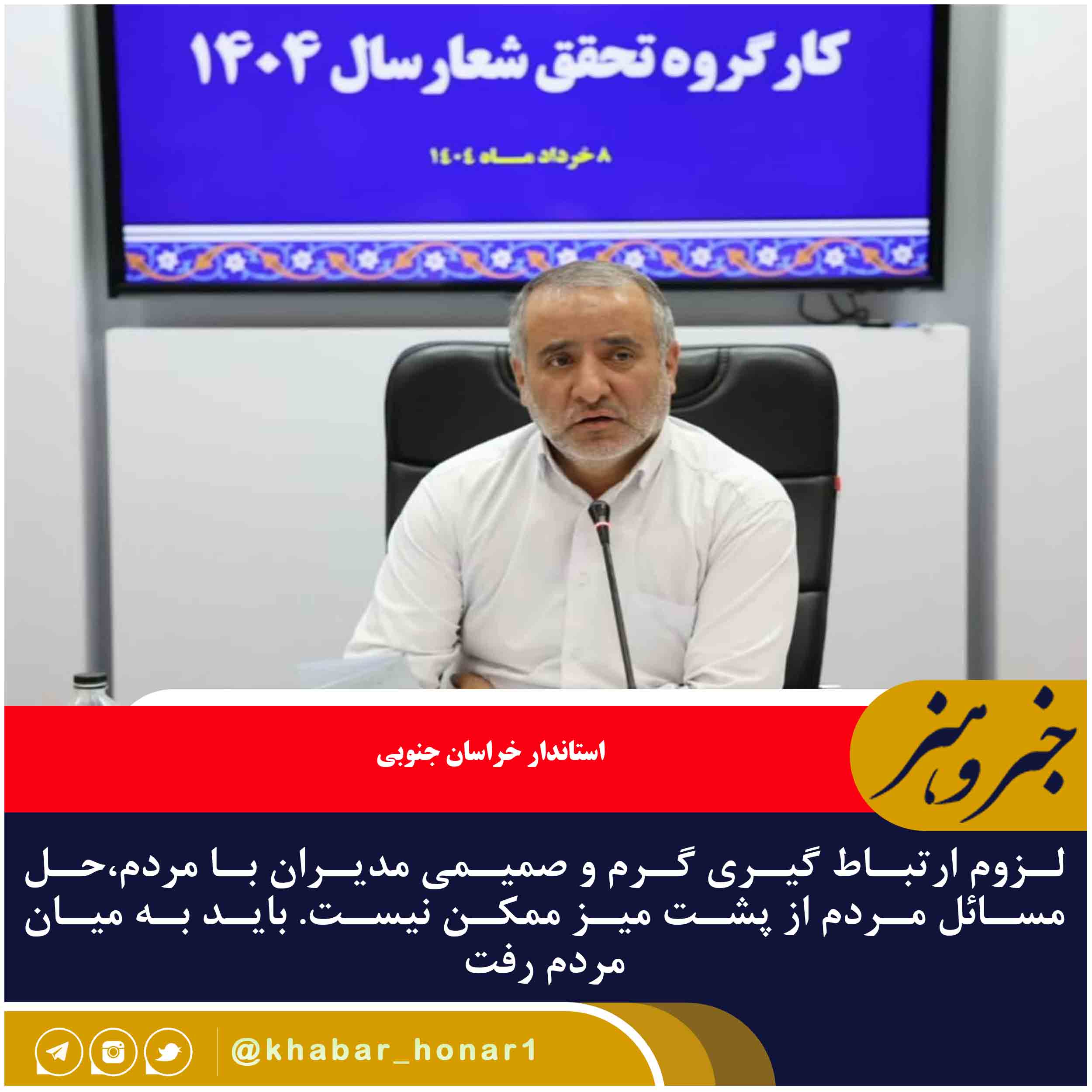 ، سید محمدرضا هاشمی  در جلسه کارگروه تحقق شعار سال استان، با تأکید بر ضرورت حضور میدانی مدیران در بین مردم، گفت: همه ما در نظام اسلامی، نوکر مردم هستیم و باید با حوصله و تواضع، سخنان مردم را بشنویم، حتی اگر گاهی تند باشد.